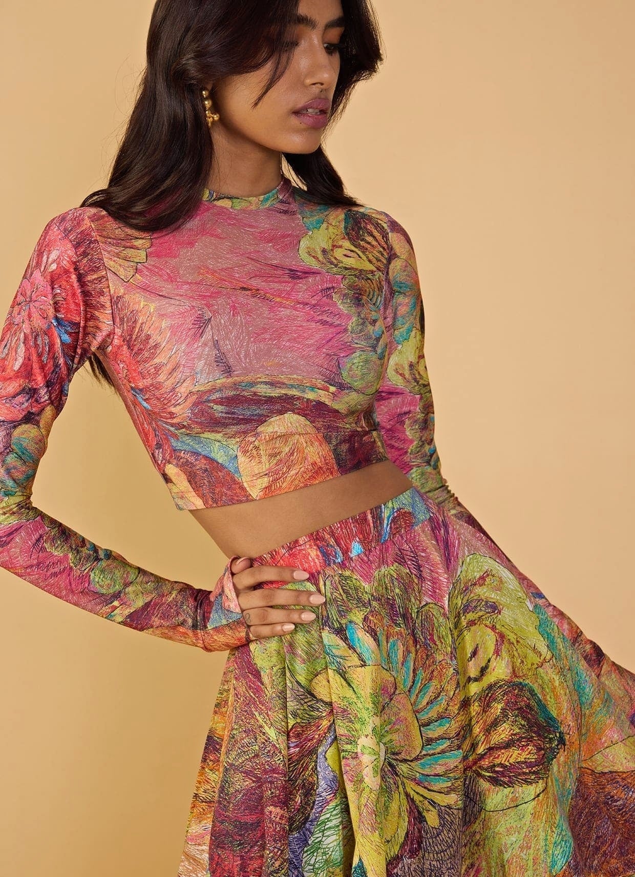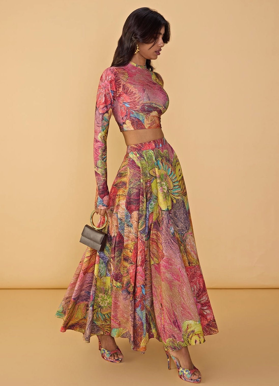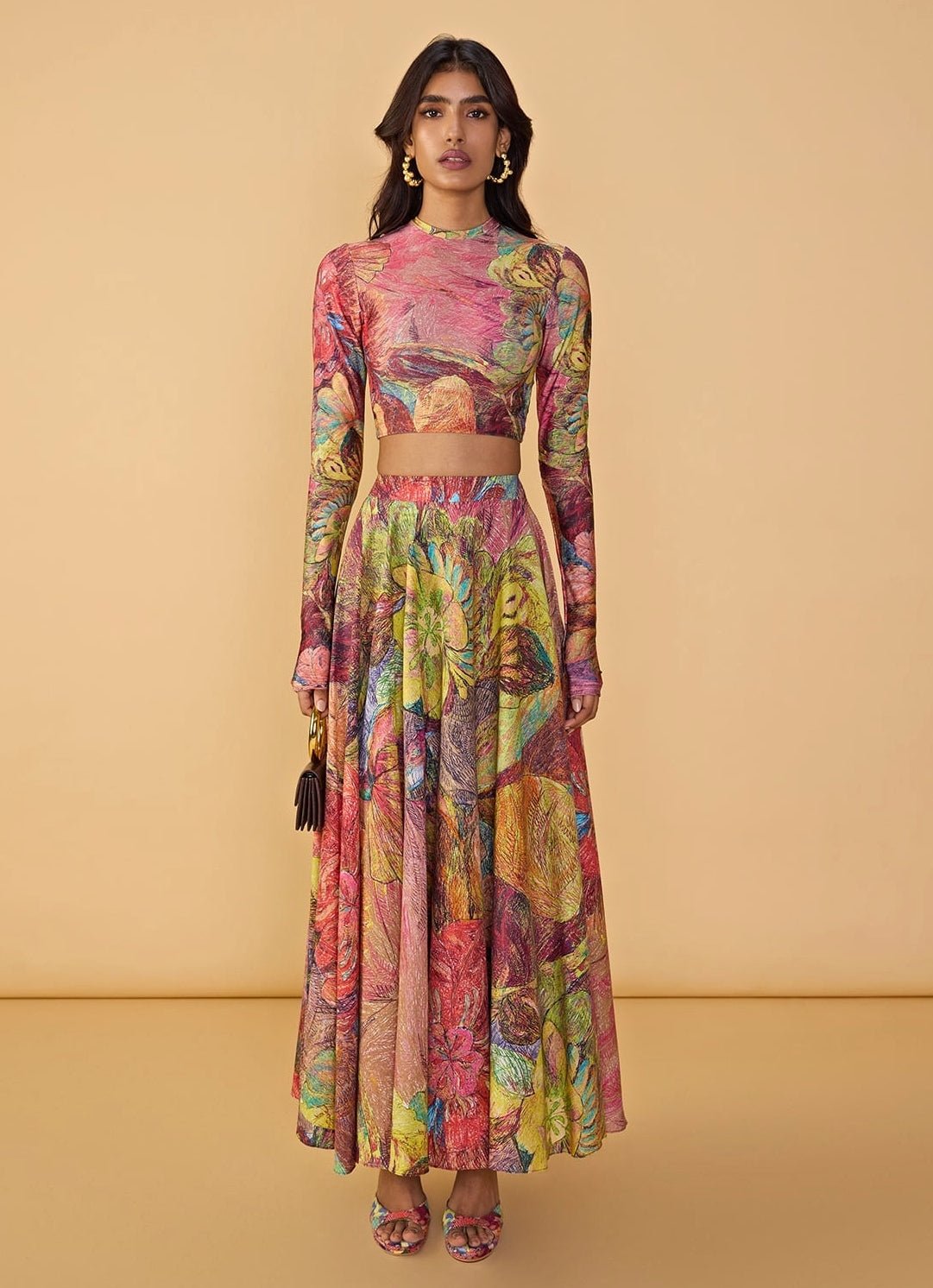 Elevate your wedding guest style with the Multicolour Printed Skirt Set that shines through every celebration. The beautiful outfit includes an abstract floral print t-shirt style blouse with long sleeve and boat style neckline, while its teamed with a high waist flared maxi skirt adorned with abstract floral placement print for a more contemporary look.