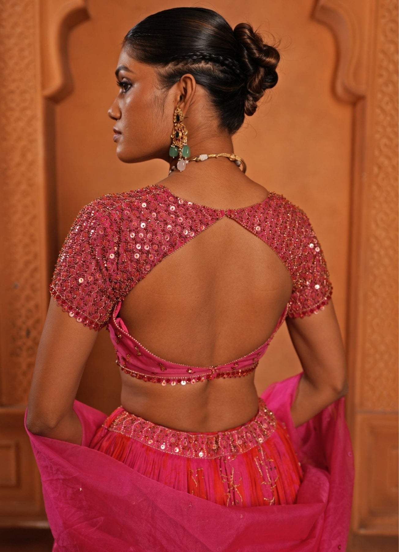 Bring playful glamour to every function with the vibrant Hot Pink and Red Lehenga Set, that brings effortless charm. The red and pink printed organza lehenga feels light and festive, creating movement that stands out on the dance floor. It is paired with a pink blouse adorned with sequins and glass bead embroidery, while the matching dupatta ties the look together with coordinated elegance.