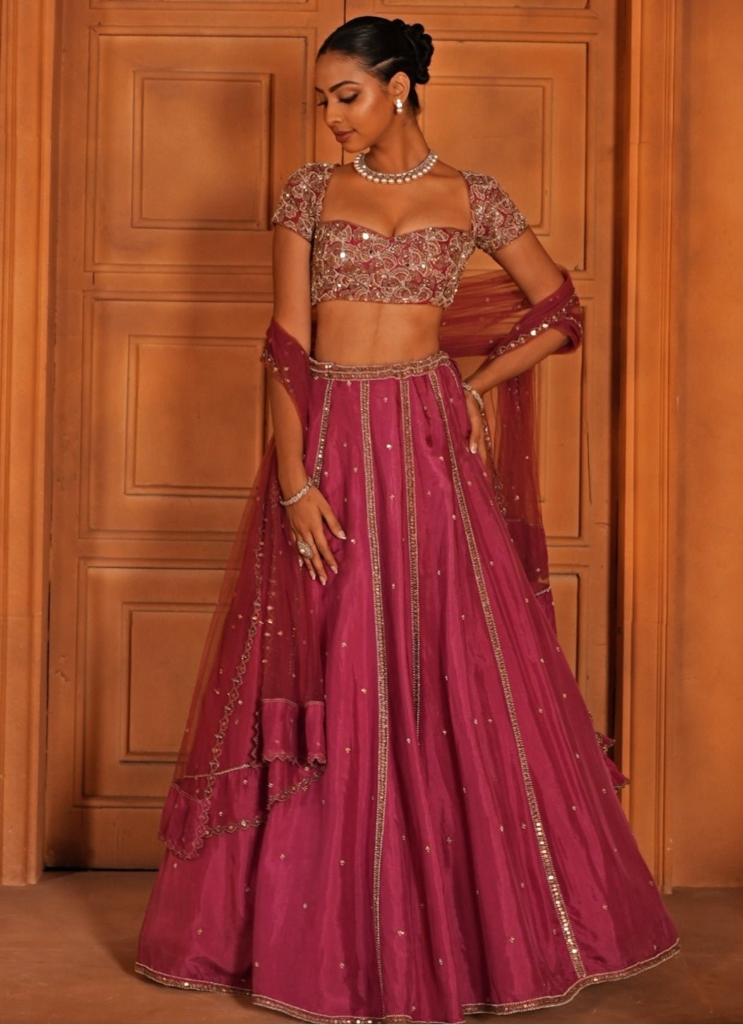 Curate colour-perfect harmony with the bold Magenta Pink Lehenga Set designed for festive flair. The silk lehenga is embroidered with pearls, zardozi, sequins and glass beads, offering rich texture and luminous detail. Paired with an embroidered blouse and a matching dupatta, this look is effortlessly striking for celebratory moments.