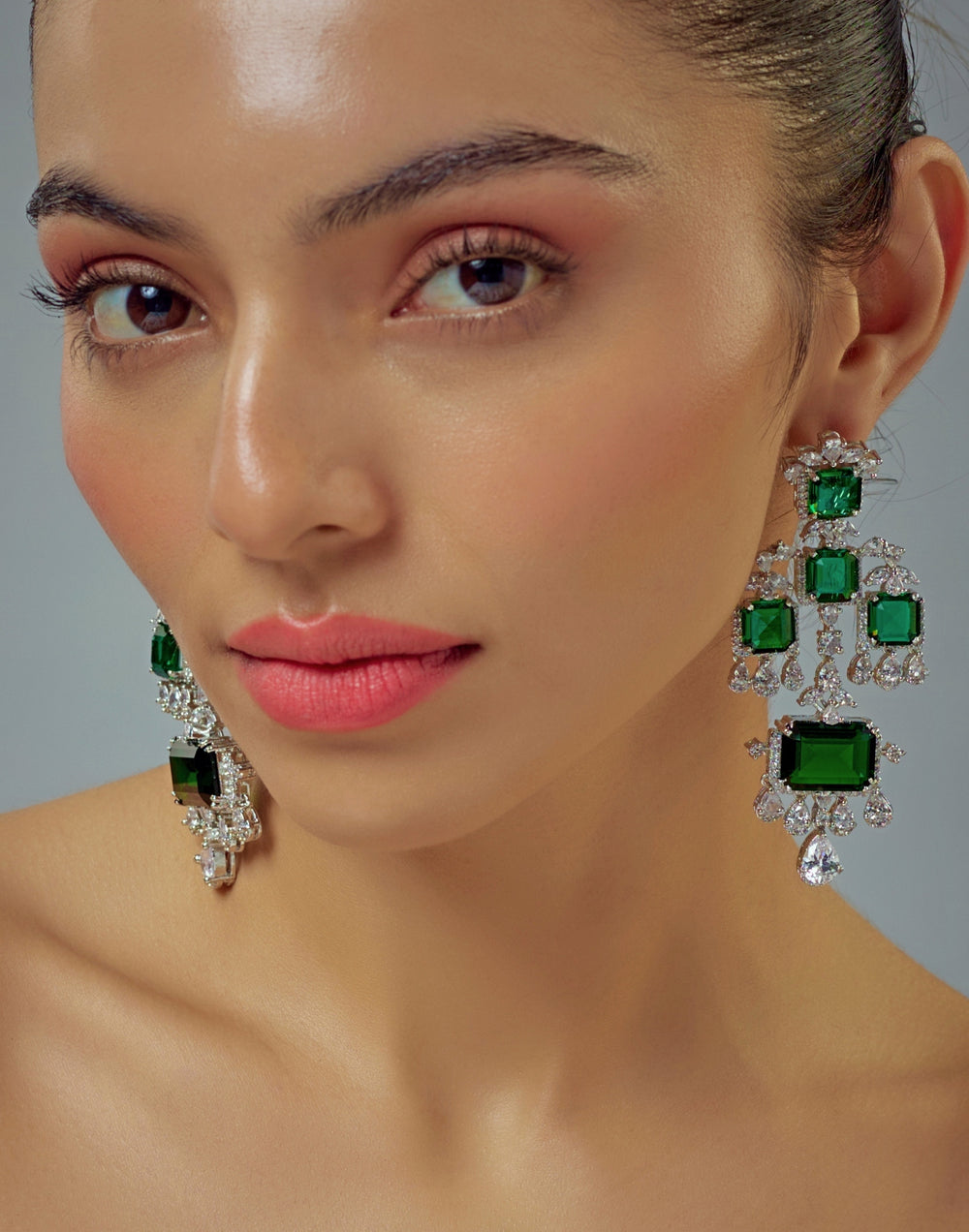 Silver Plated Emerald Green and Zircon Dangler Earrings