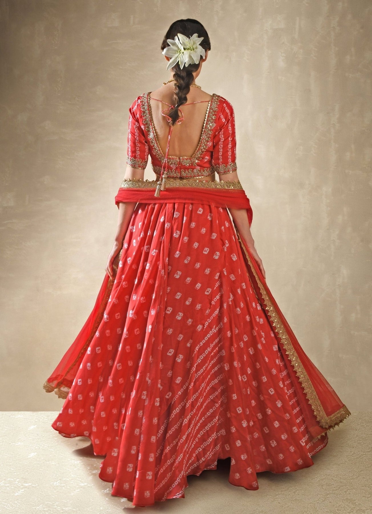Step into elegance with the Red Embroidered Bandhani Satin Lehenga Set, a captivating blend of traditional charm and modern flair. Made from luxurious satin, the voluminous red lehenga showcases intricate layers of Bandhani patterns, forming a timeless, flowing look enhanced by cancan for added volume and functional pockets for convenience. Paired with a striking V-neck blouse is embellished with shimmering mirrors, pearls, gold sequins, and delicate dori work, transforming the rich red fabric into a breathtaking masterpiece. Completed with a sheer dupatta with an embroidered cutwork border adds an ethereal and refined touch.