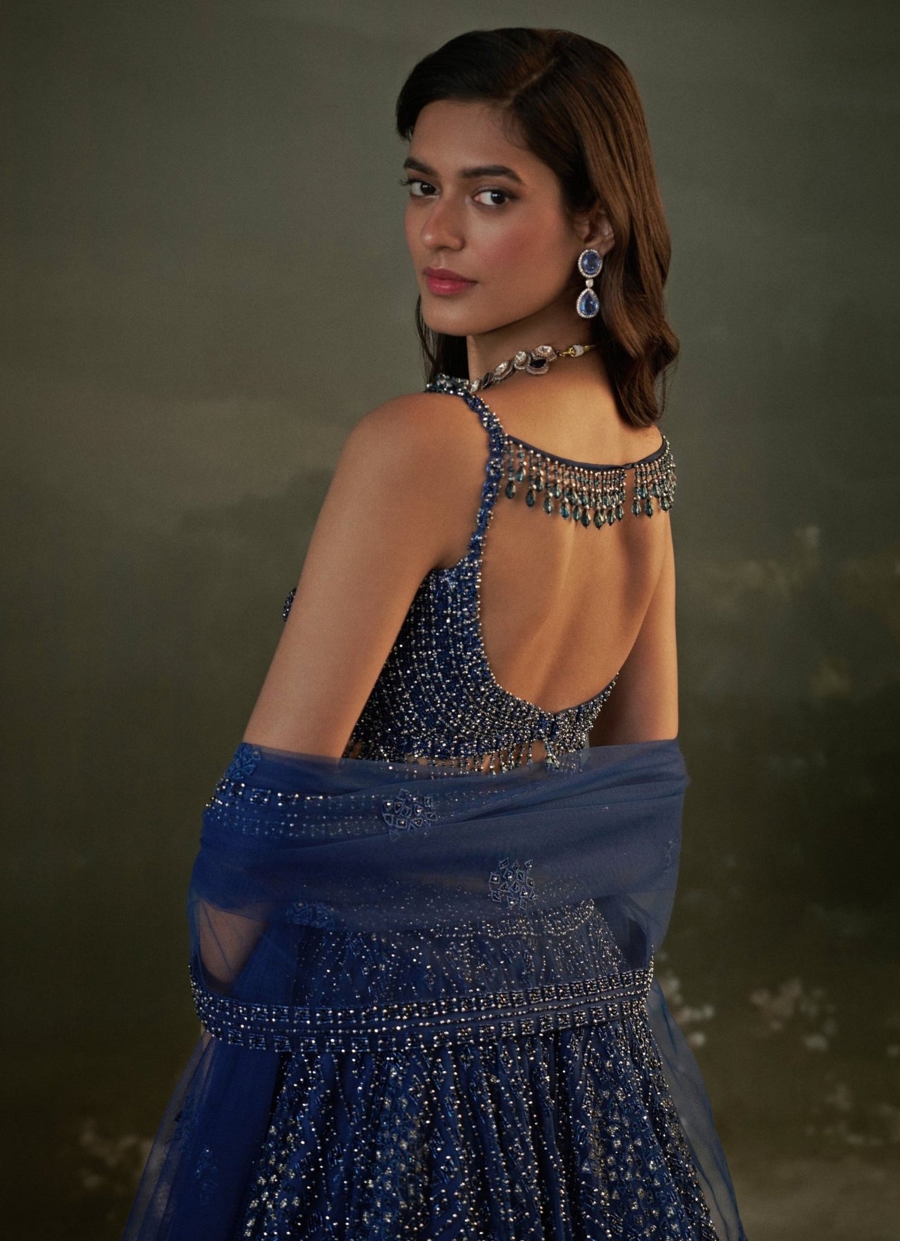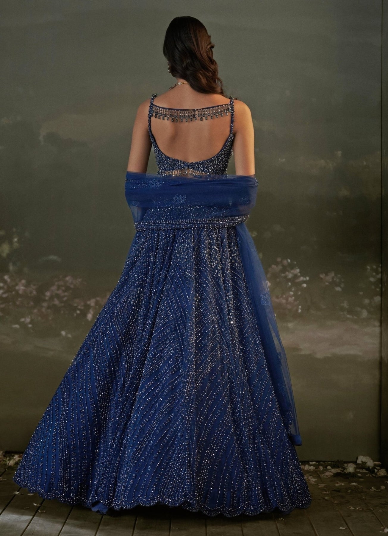 Elevate your pre-wedding festivities in this Midnight Blue Lehenga Set that reads like a night sky under sangeet lights. The lehenga is finished with delicate tonal embroidery in beads, sequins, and crystals for a subtle, luxurious shine, paired with a matching blouse that keeps the look sleek. A coordinated dupatta completes the set with lightweight elegance, so you stay comfortable through every performance and toast.