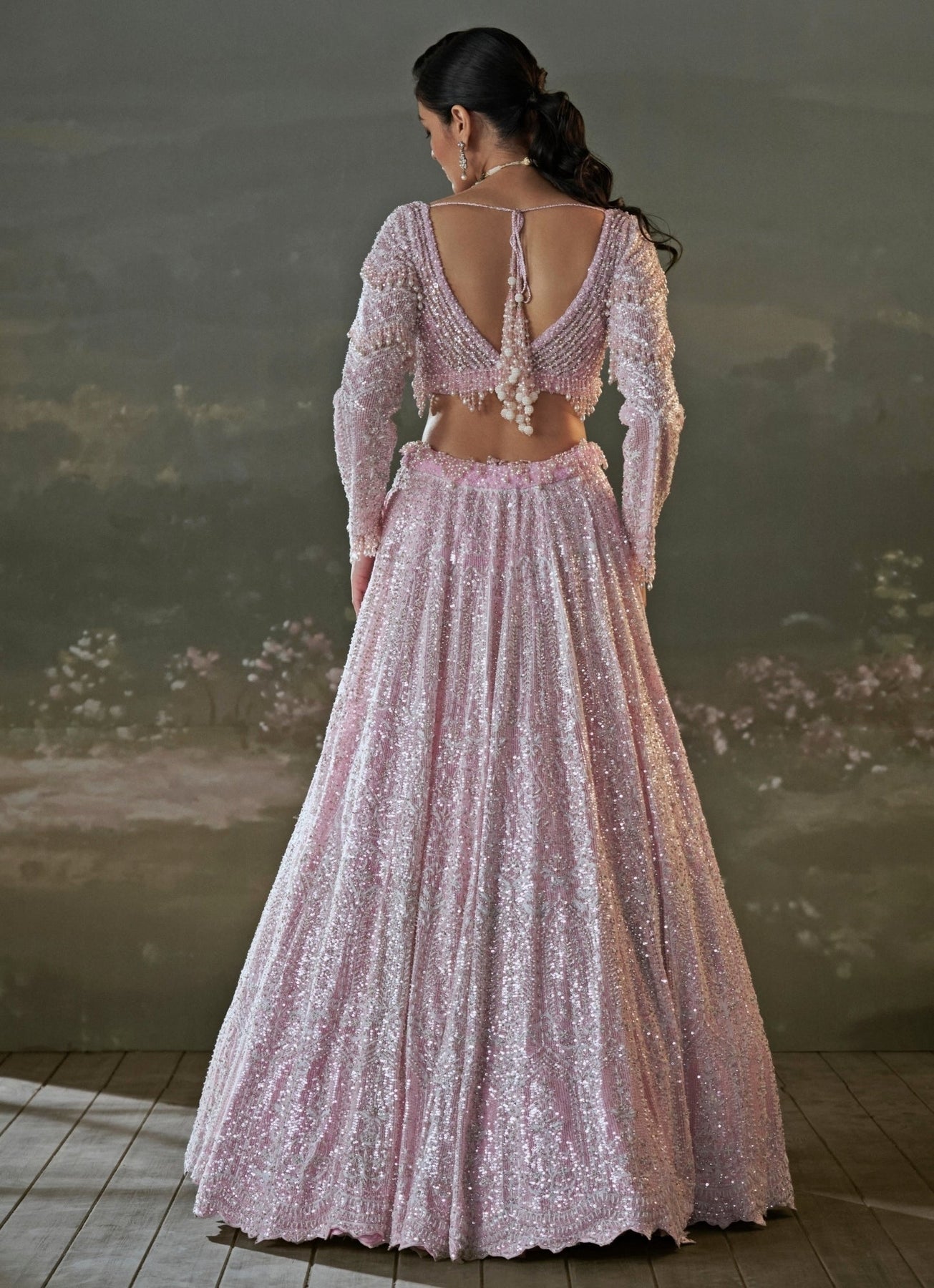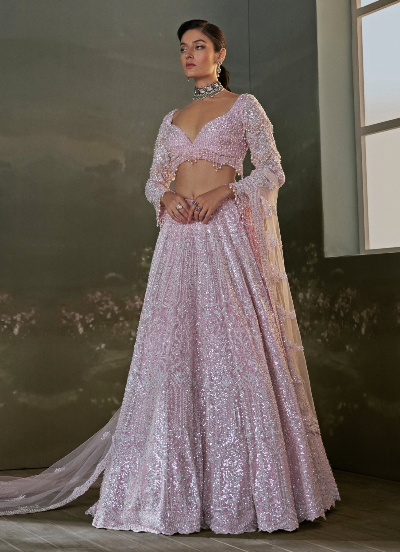 Celebrate each milestone moment in the Pink Lehenga Set that blends romance with modern sparkle. The lehenga is intricately embroidered in tonal and ivory sequins, beads, and crystals, creating dimension that photographs beautifully from every angle. The matching blouse and dupatta keep the look cohesive, while the lightweight net ensures comfort through ceremonies and dancing alike, without compromising on sparkle or comfort.