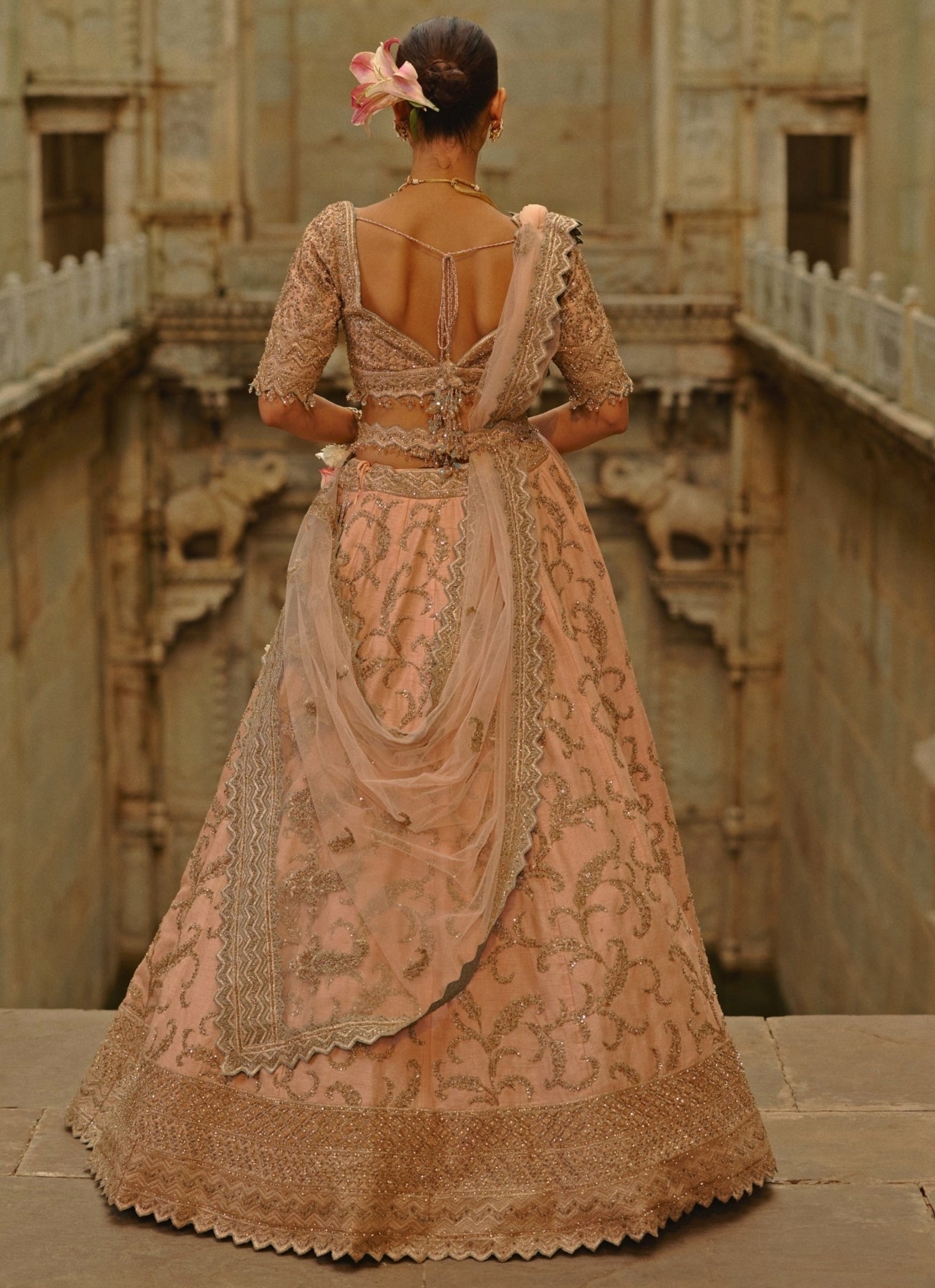 Radiate bridal splendor in this Soft Peach Bridal Lehenga Set, designed for modern celebrations. The lehenga is intricately embroidered with dabka, sequins, and delicate beadwork that creates a refined shimmer with movement, while the matching blouse mirrors the same artisanal craftsmanship. A coordinated dupatta completes the look beautifully, with the option to add a veil for added drama and grace.
