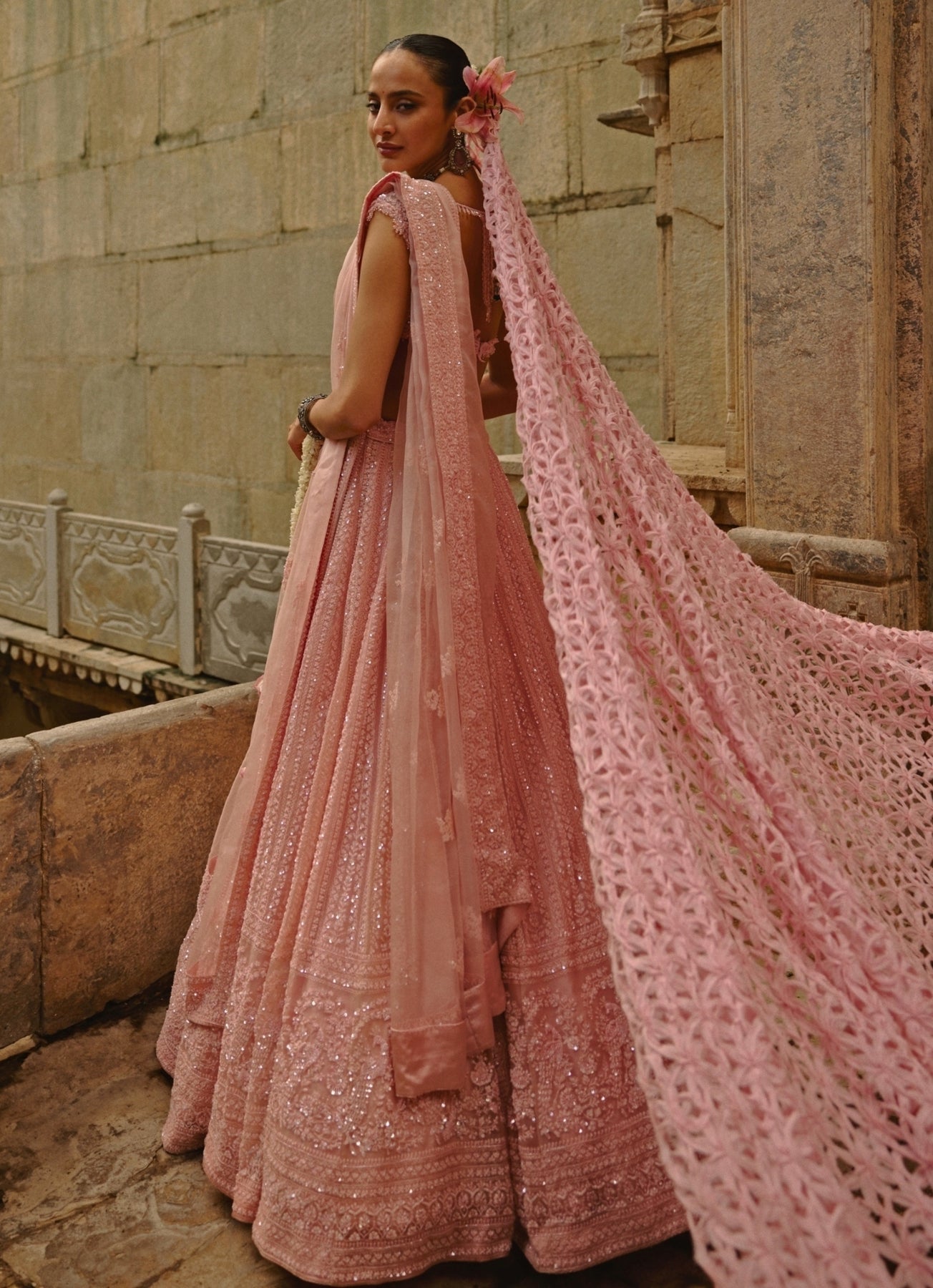 Step into your happily-ever-after wearing this Soft Pink Lehenga Set designed for romantic bridal evenings. The lehenga showcases delicate threadwork highlighted with shimmering sequins, creating subtle sparkle, while the blouse complements the refined detailing. Finished with a dupatta and an optional veil, this look feels graceful, modern, and effortlessly elegant.