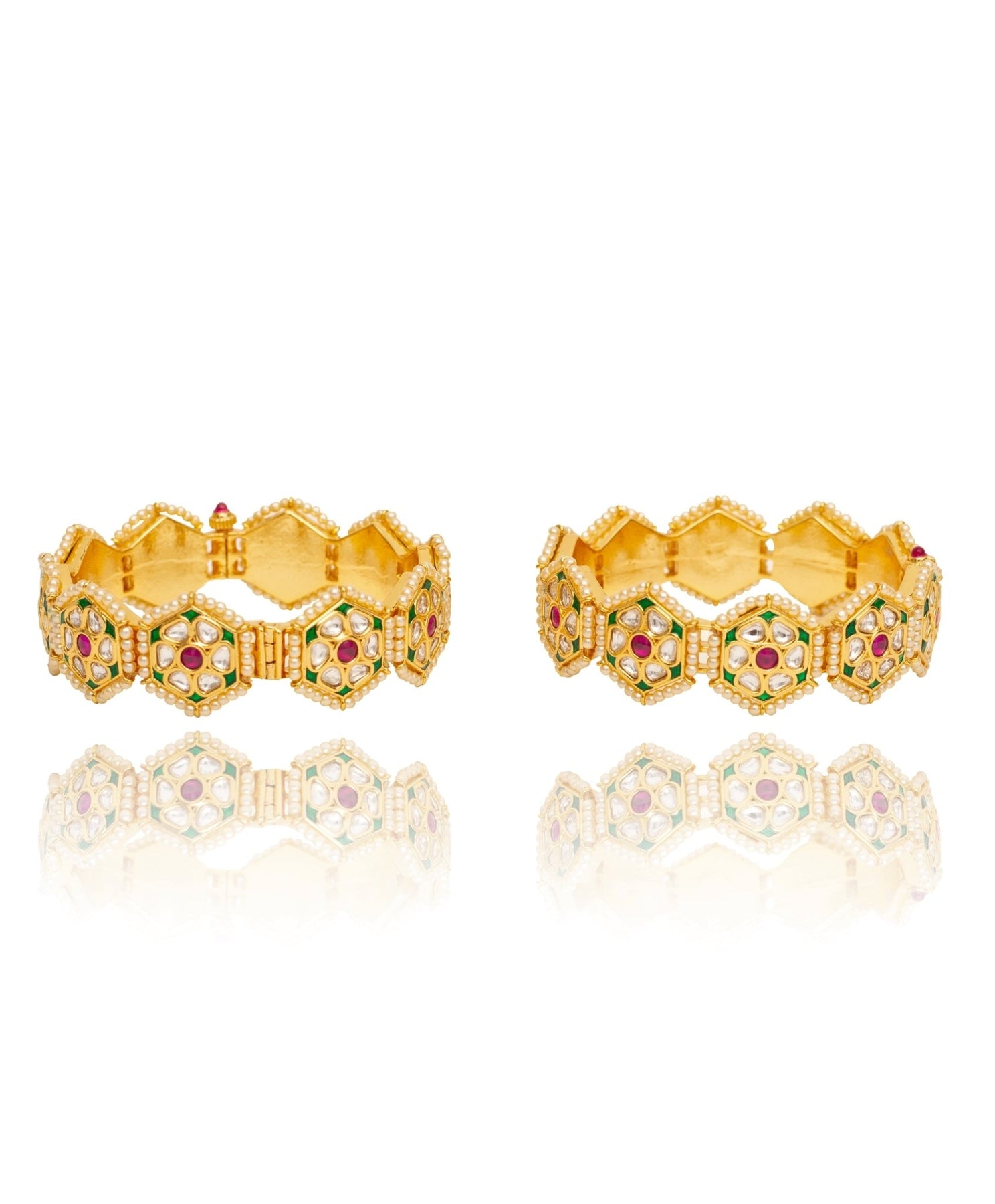 God Plated Red and Green Stone Bangles features a classic hexagonal pattern that is embellished with vibrant multicolored gemstones and intricate pearl detailing for a rich look. Luxurious gold polish enhances the overall elegance and traditional appeal.