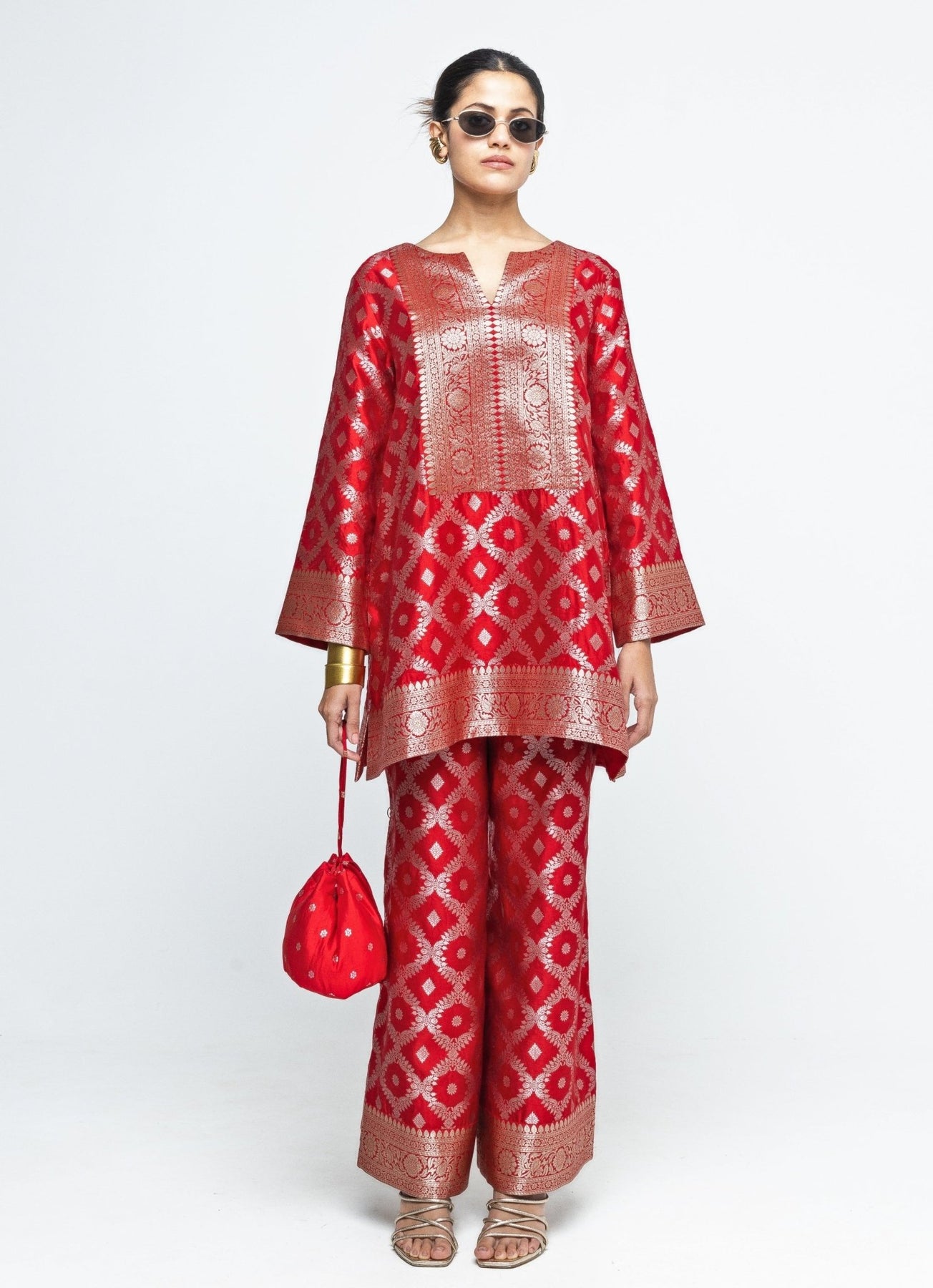 Red Jaal Silk Kurta Pants Set Sobariko - Fabilicious Fashion