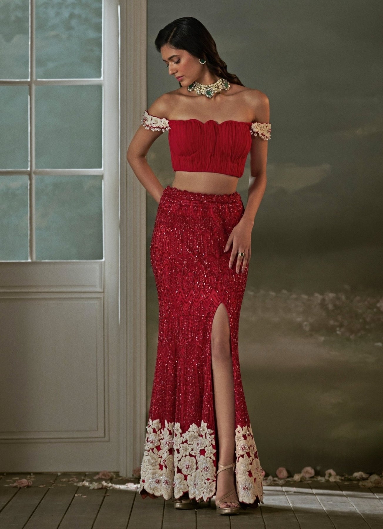 Glow with anticipation and style in the Red Skirt Set that’s richly embroidered with sequins and crystals for high-shine festivities. The hem is framed with an ivory floral resham border, highlighted with pearls and crystals for a distinctly bridal touch. Pair it with the pleated crop top for clean structure, then finish with the net dupatta embroidered for added texture and sparkle.
