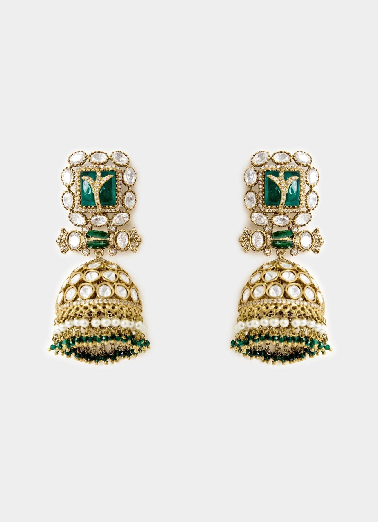 Stunning gold-tone jhumka earrings adorned with pink and green stones, finished with pearl detailing. A Gorgeous statement accessory for weddings, festive occasions, and traditional ensembles.