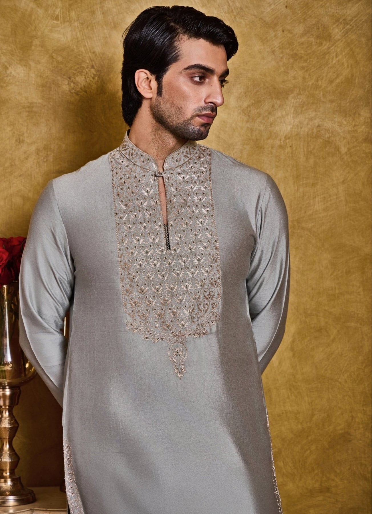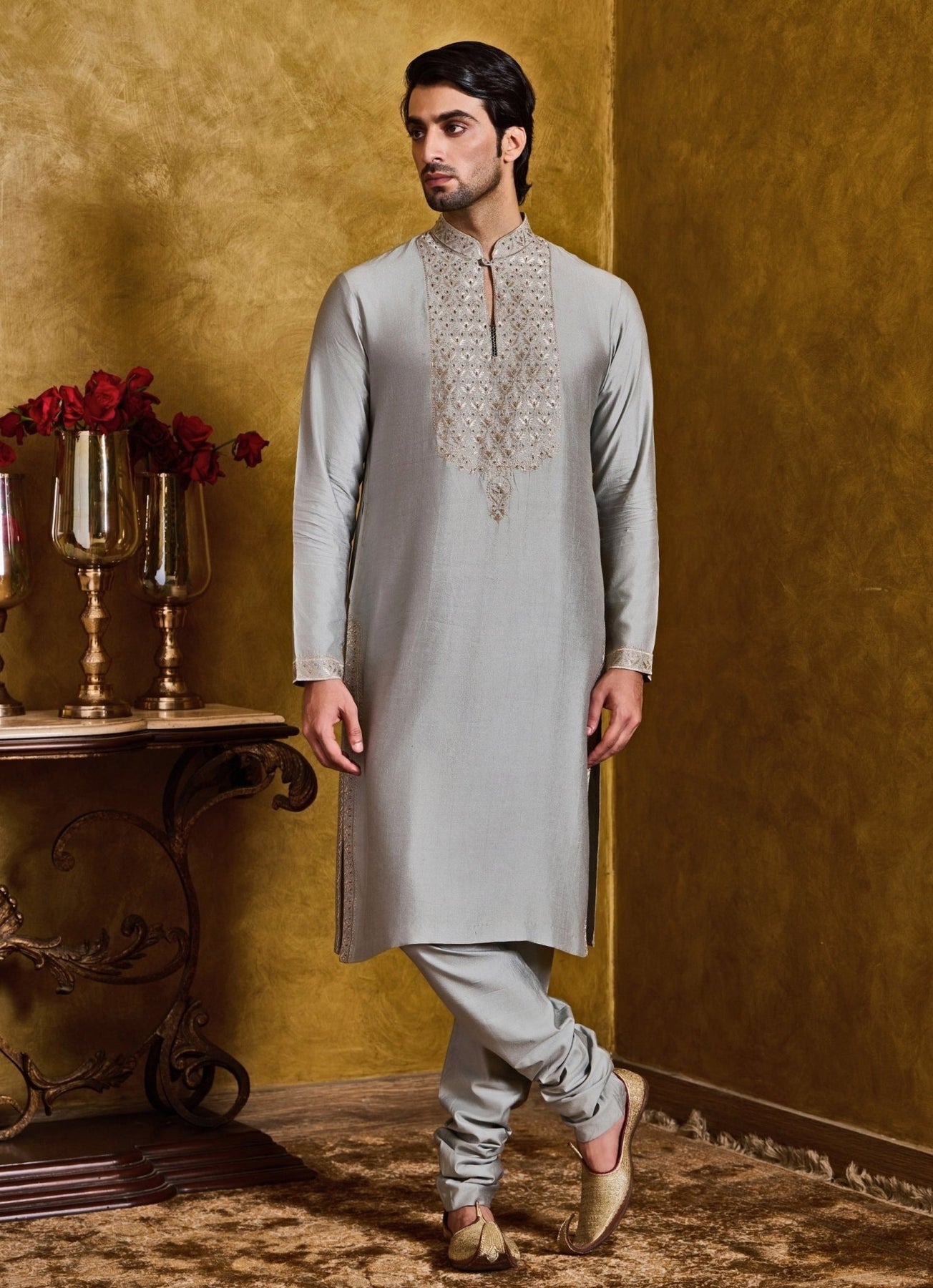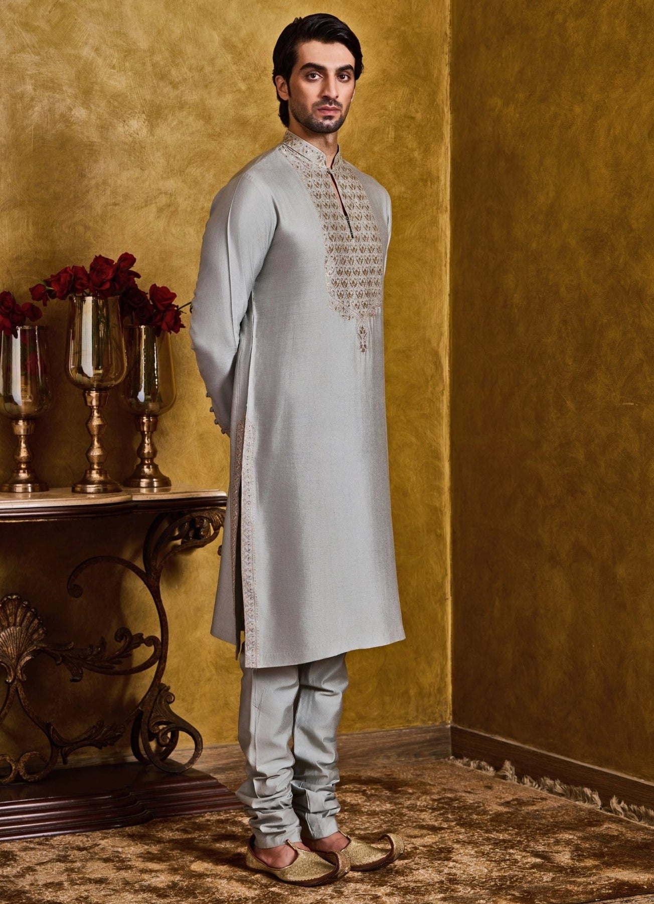 Celebrate in elegance with refined Grey Green Kurta Set that feels light yet festive. The kurta is detailed with intricate single thread kasab embroidery, adding artisanal character without overwhelming the look. It is paired with a coordinated churidar for a polished presence at intimate ceremonies and gatherings.