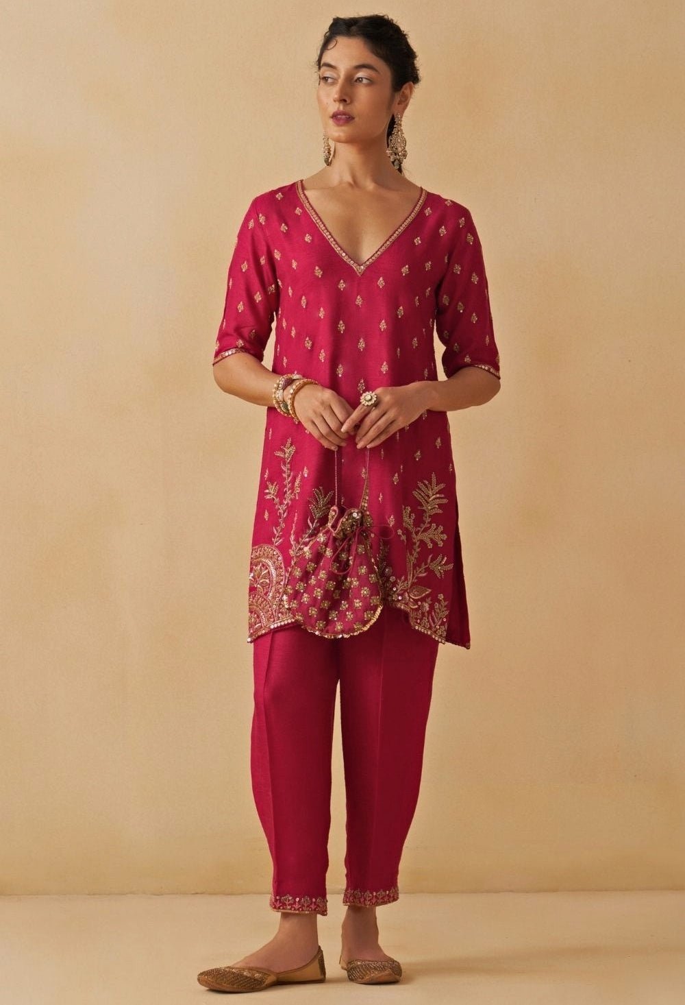Celebrate your loved one’s big day in this Hot Pink Kurta Salwar Set that brings bold colour with a luxurious finish. The matching salwar adds an easy, traditional touch, while the V-neck short kurti is defined by zardosi embroidery along the hemline for a rich, festive shimmer. Designed to feel light yet impactful, it’s perfect for engagement gatherings when you want to look vibrant, confident, and effortlessly put together.