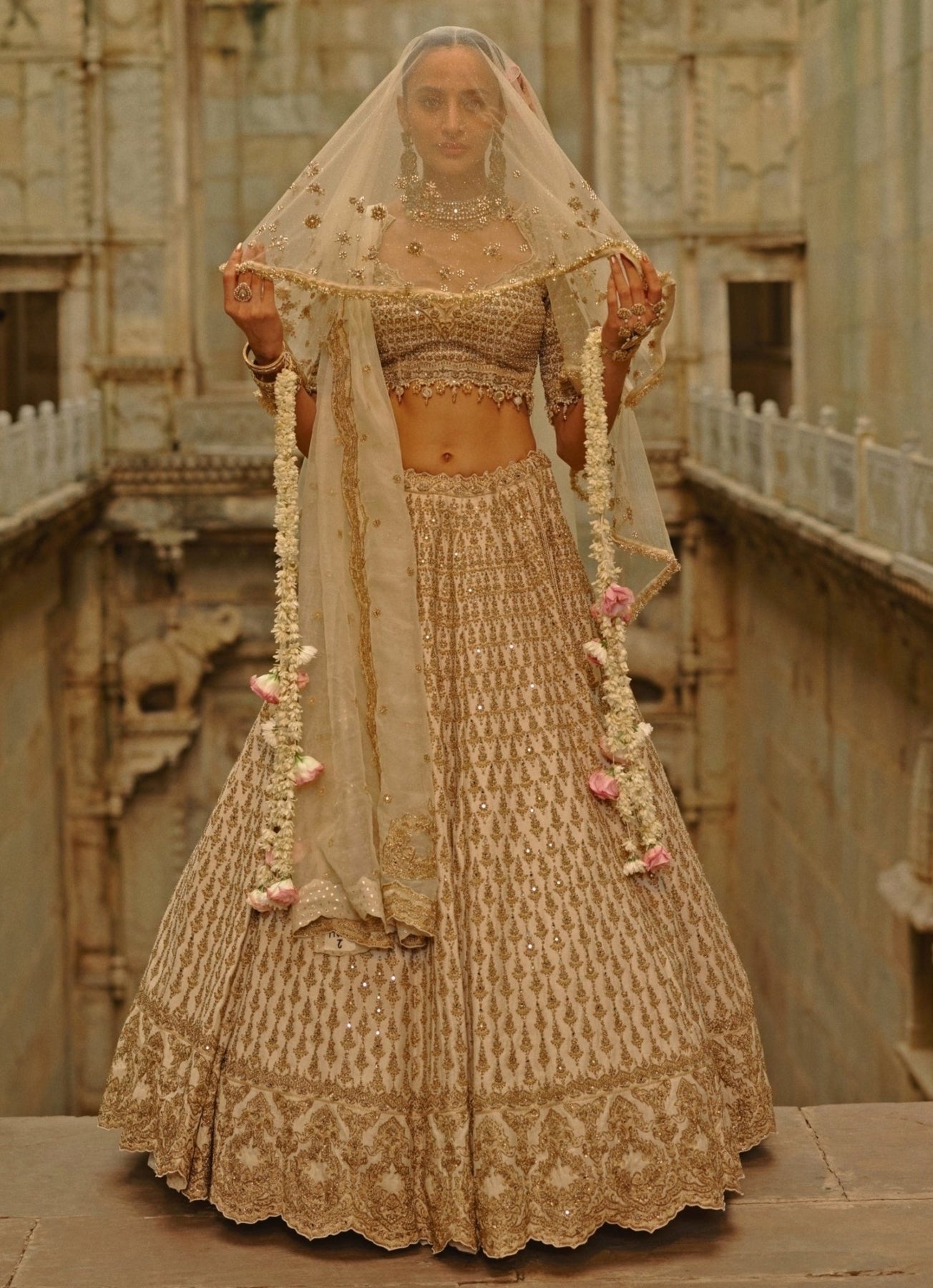 Capture the essence of your dream wedding in this timeless Cream Lehenga Set that exudes understated luxury. The lehenga is hand-embroidered with mirror work, zari, zardozi, dabka, and pearl detailing, creating soft radiance, while the blouse completes the look seamlessly. A coordinated dupatta and optional veil add an extra layer of sophistication for evening celebrations.