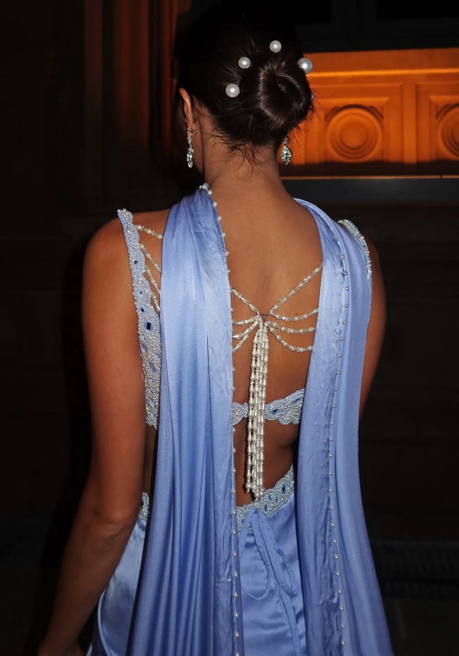 Turn heads at every celebration in this blue satin drape skirt set. The fluid satin skirt glides with understated shimmer, while a pearl-and-mirror embroidered blouse and satin stole elevate the look.