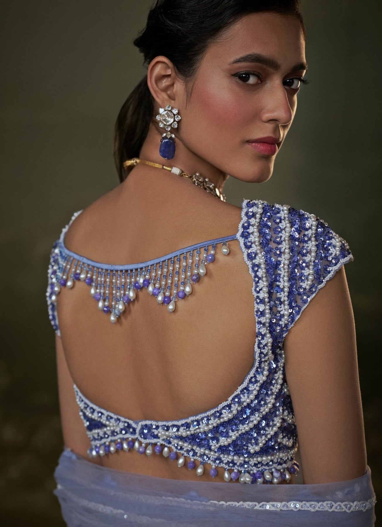 Dress the part for your unforgettable moments in the Blue Lehenga Set that balances richness and grace. The voluminous lehenga flows gracefully while the blouse are embroidered with tonal light and dark resham, beads, sequins, crystals, and ivory pearls. Finished with a matching dupatta, the look feels regal and refined.