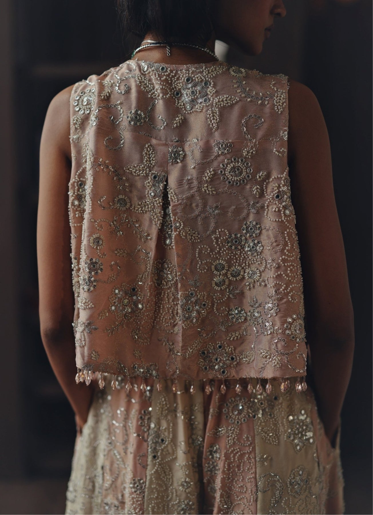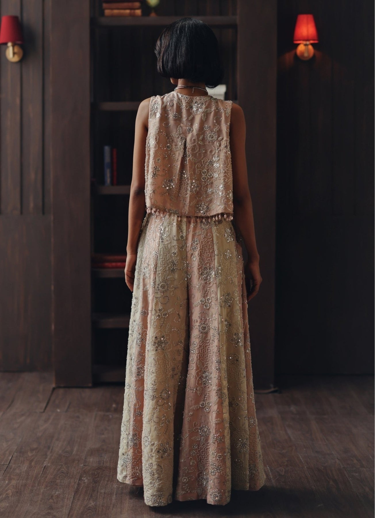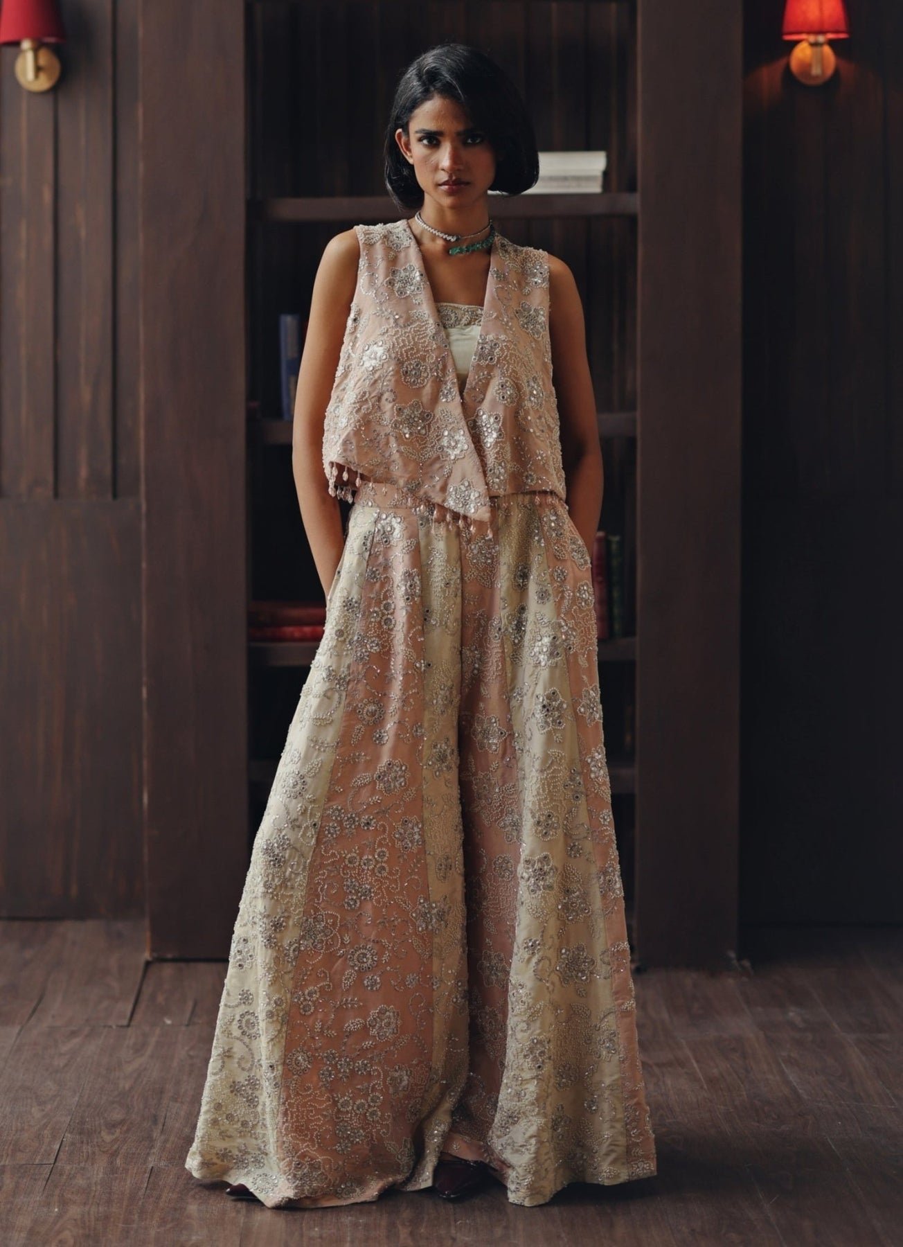 Elevate family festivities in this Blush Pink Palazzo Set, crafted for soft sophistication. The asymmetric sleeveless jacket showcases delicate mirror and bead embellishment placed on dual tulle for subtle dimension. Panelled palazzos continue the embellished detailing, while the tissue bandeau adds a contemporary finish.