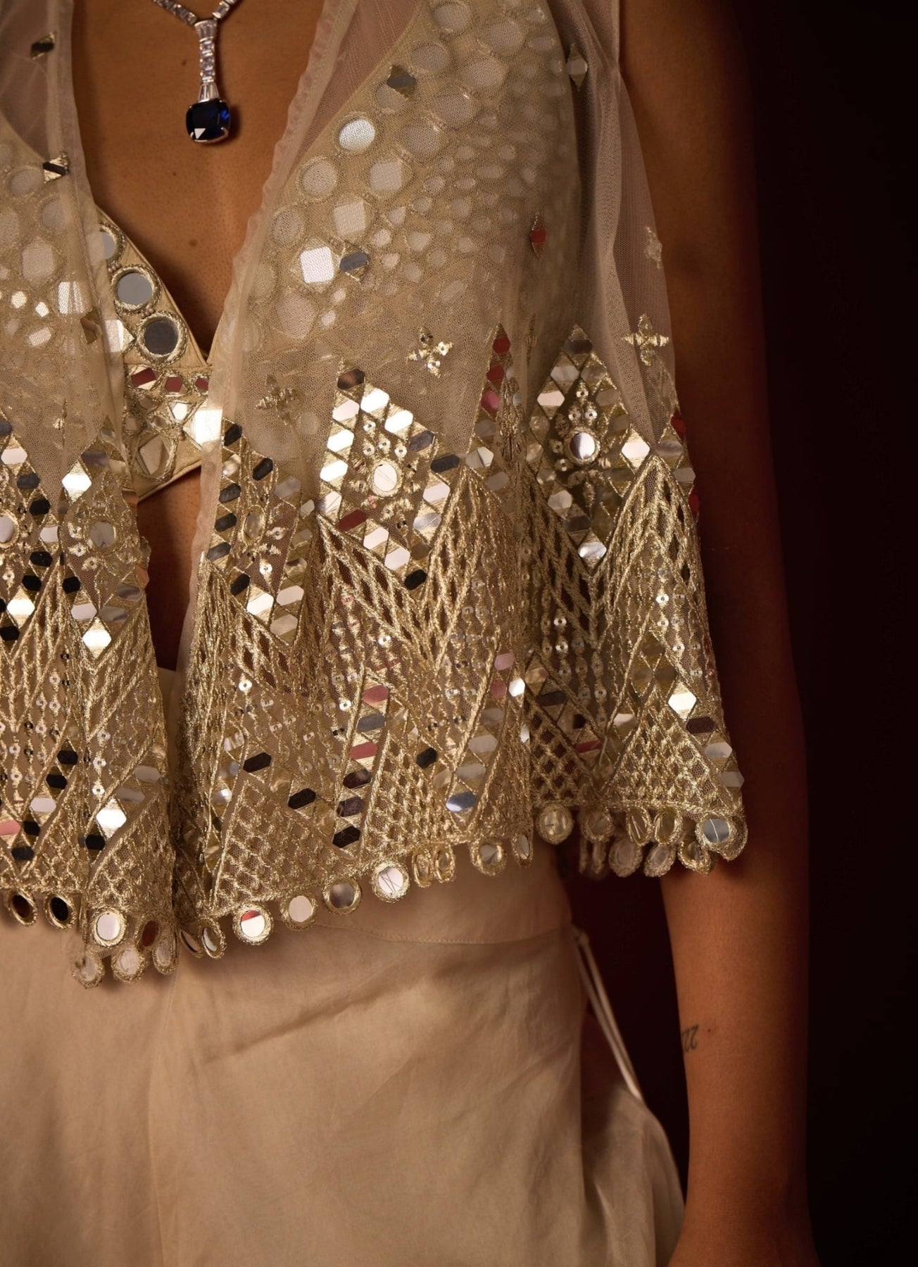 Mark the moment with refined dressing in this Ivory Pants Set with Jacket, where soft net and organza come together in modern harmony. The asymmetrical mirror-worked jacket showcases intricate zari jaali craftsmanship, complemented by a hand-embroidered chanderi bralette finished with playful tassels. Organza flared pants complete the set with airy elegance, creating a statement fit for destination festivities.