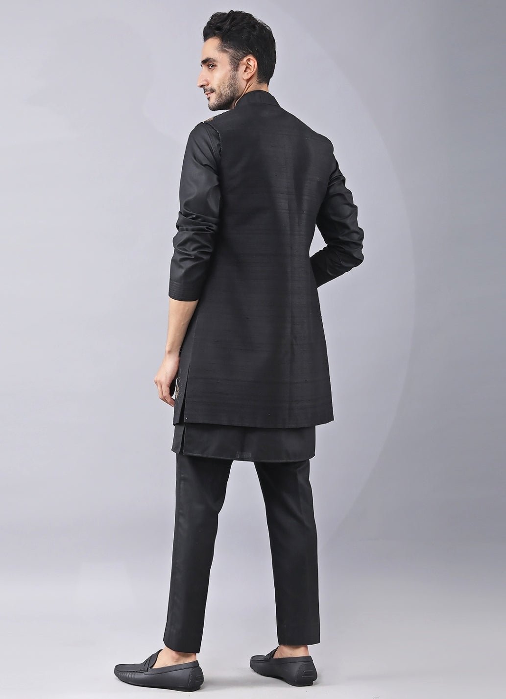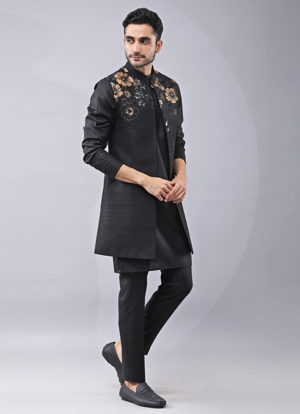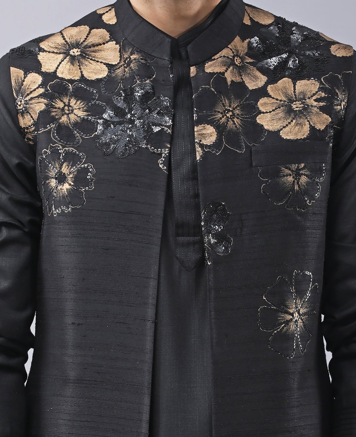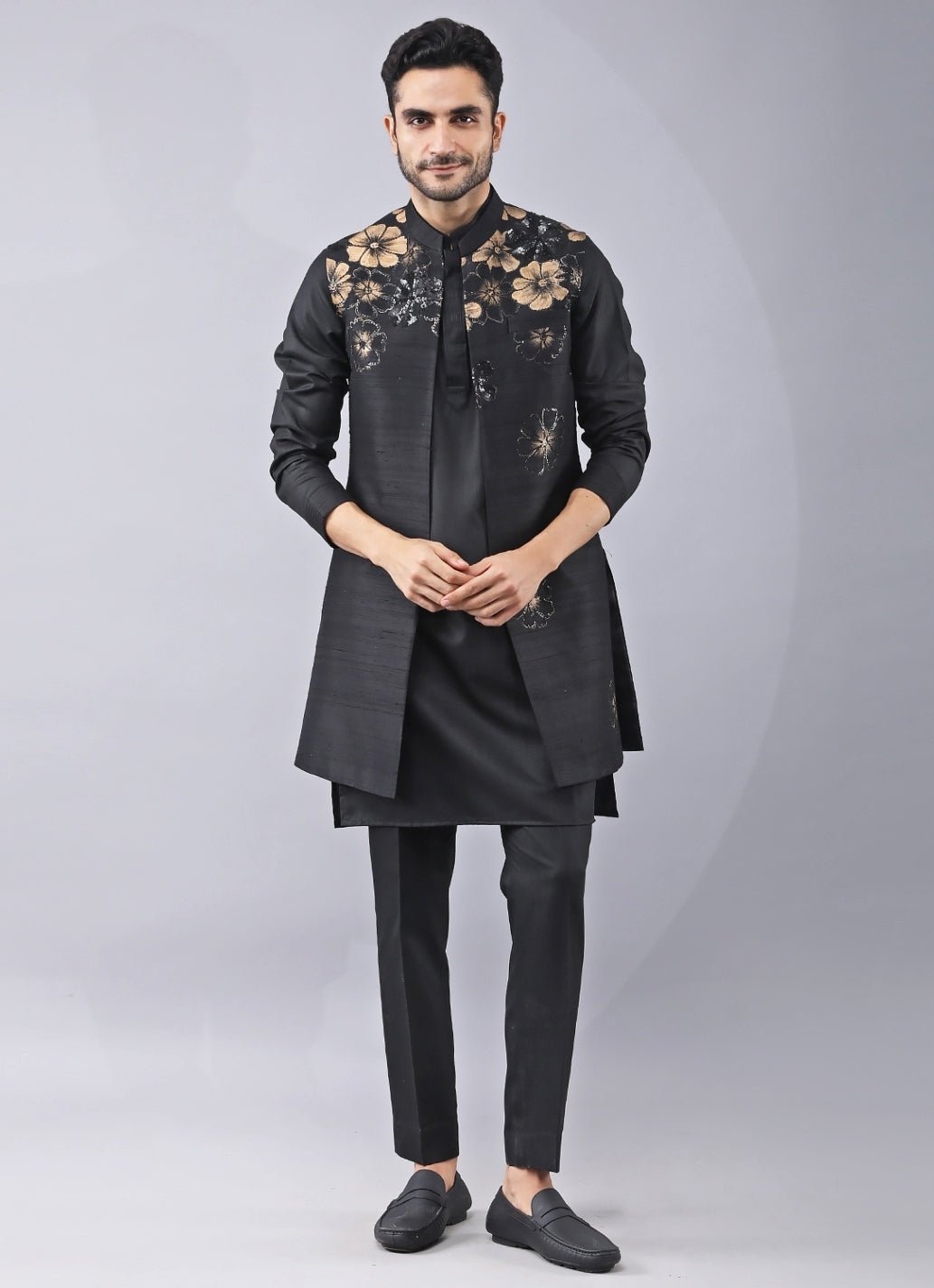 Bring groom-to-be glamour to evening celebrations in this Black Kurta with Long Jacket Set. The placement print is lifted with highlighted hand embroidery, adding handcrafted richness that reads luxurious under reception lighting. A coordinated kurta layers smoothly, while tailored pants keep the finish crisp for photos and formal moments. Style with a pocket square and glossy loafers for sharp impact.