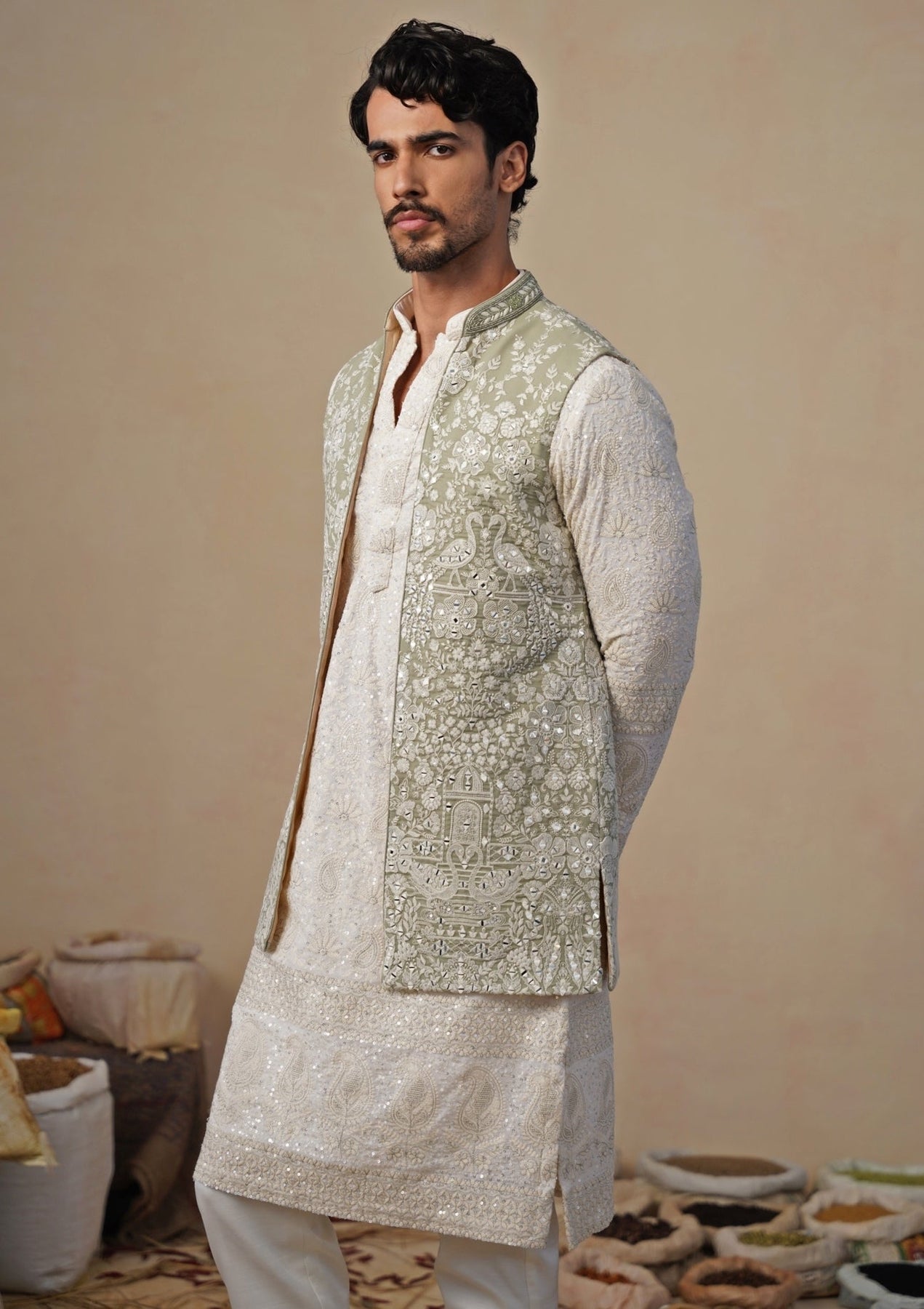 Designed for modern festive dressing, this Ivory and Pastel Green Kurta Jacket Set blends subtle colour with rich craftsmanship. The straight pants keep the profile clean and contemporary. A refined georgette kurta offers gentle texture, while the sleeveless jacket features traditional-inspired embroidery with mirror accents that add dimension and light. The look feels fresh, graceful, and ideal for daytime wedding celebrations.