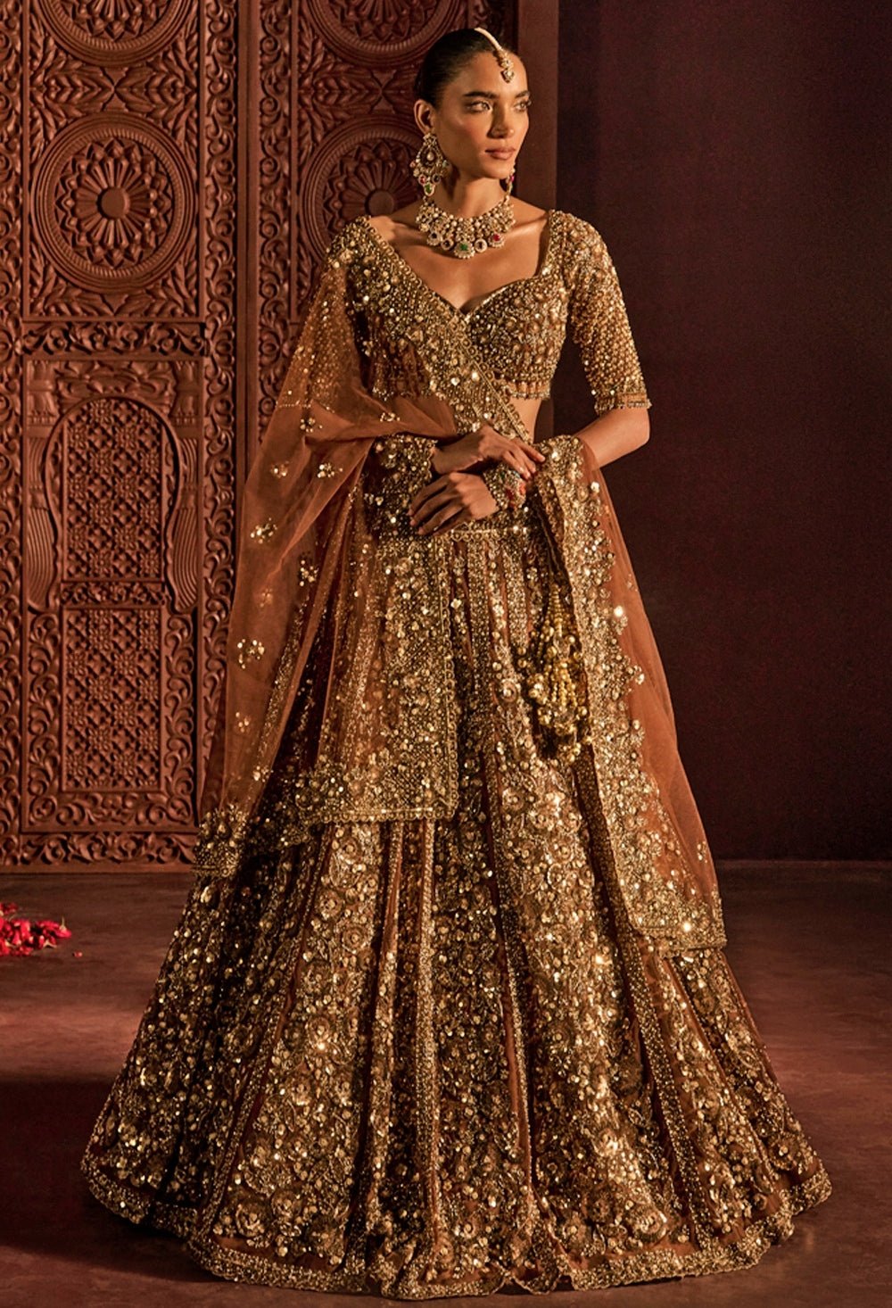 Transform your bridal look into an icon with this Mocha Brown Lehenga Set, perfect for a high-glam cocktail entry. The embellished lehenga is richly finished with zardosi and sequins embroidery for radiant depth. A matching blouse features tassels highlighting the waist for a playful touch, while the sheer embroidered dupatta completes the look with a luxe, editorial finish. Perfect Lehenga for Bride for Big Day, Cocktail & Reception.