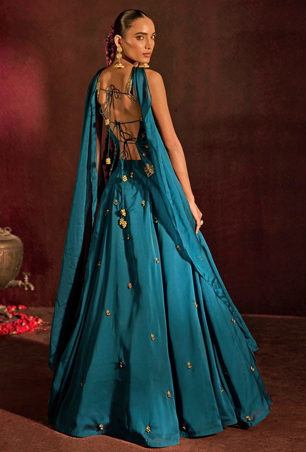 Capture graceful tradition in this Teal Blue Corset Lehenga Set, a standout pick for family celebrations at Sangeet. The A-line lehenga is detailed with ghungroo butis for festive movement, while the corset-style long top is embroidered with zardosi and sequins for a statement finish. A choker-neck dupatta with an embroidered panel adds a dramatic, modern edge. Perfect Lehenga for Wedding family for Sangeet, Cocktail & Reception..