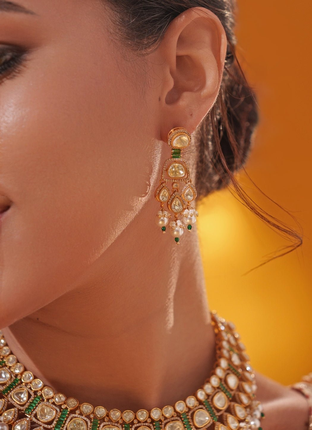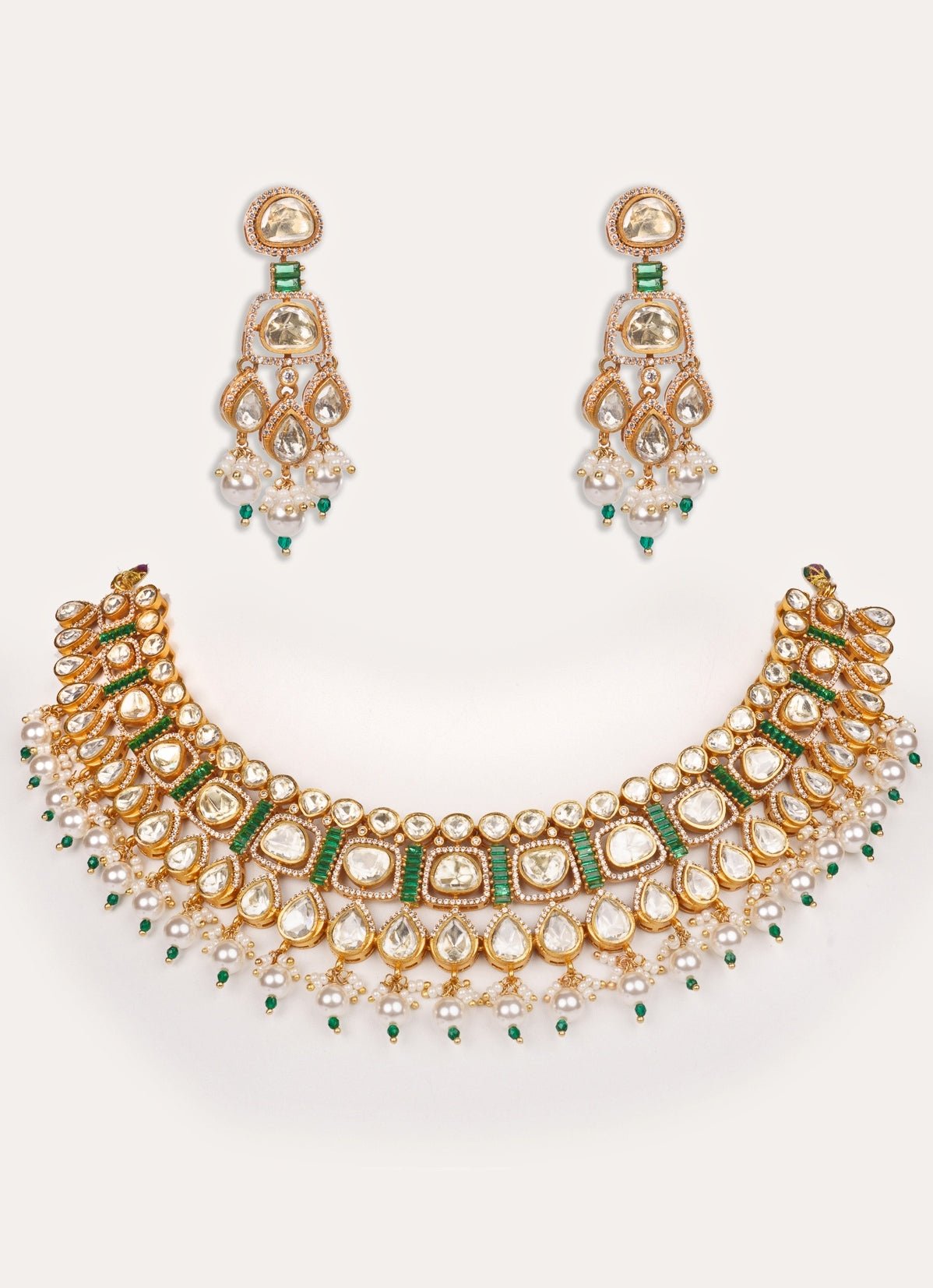 Showcasing vibrant green brilliance and refined craftsmanship, this moissanite necklace set radiates timeless elegance. It comes with matching earrings and balances tradition with modern luxury in a luminous gold setting — a polished statement for a saree.