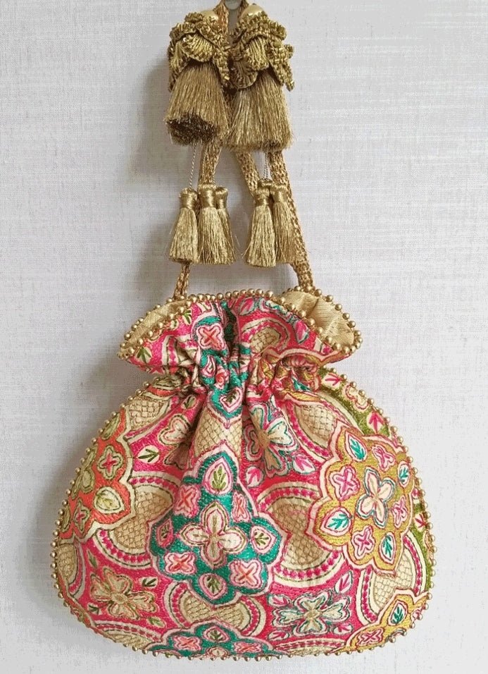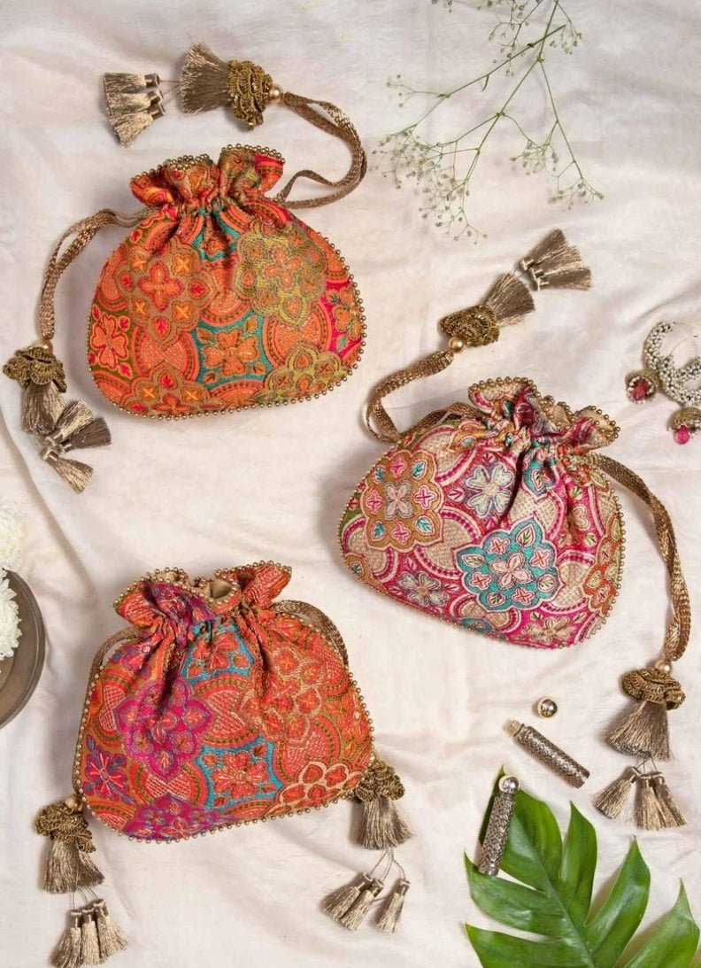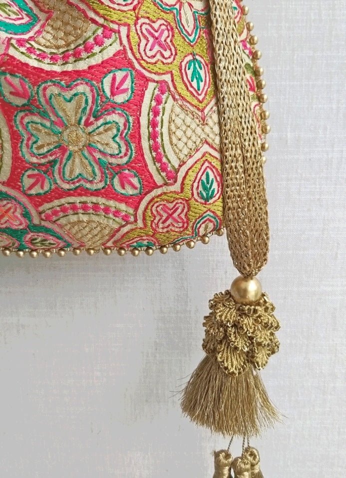 An ode to classic design with a playful element of lace and tassels. Rich in character, Kutch embroidery in vibrant colours is finely worked on a silk canvas. Elegant golden crochet silk tassels add to its opulence and festive charm. Perfect Ivory Potli for your Lehenga.