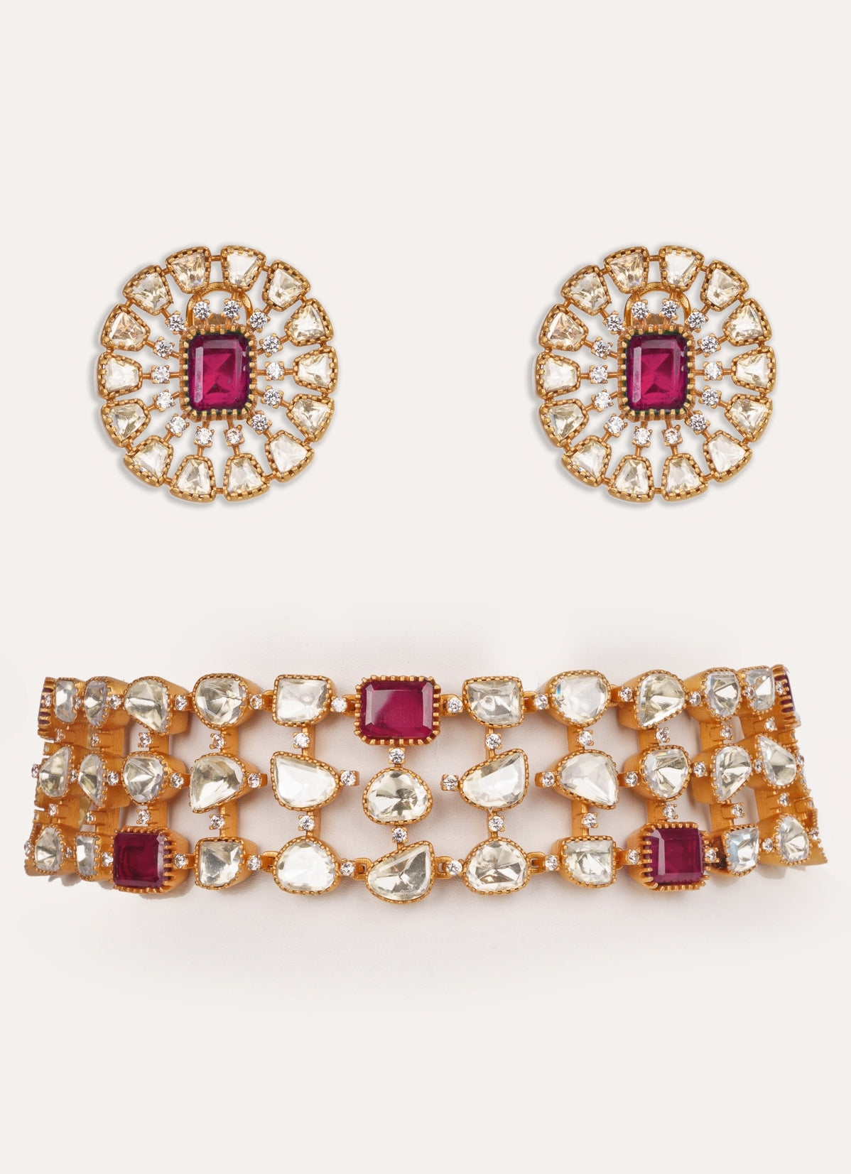 This exquisite choker gleams with radiant moissanite and red stones, capturing the light with every movement. Paired with matching studs, it blends traditional artistry with contemporary allure for a sharara suit.