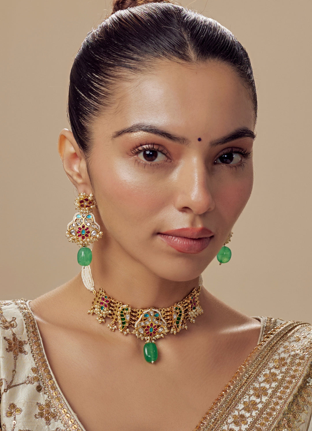 Gold Plated Green And Red Kundan Choker Necklace Set