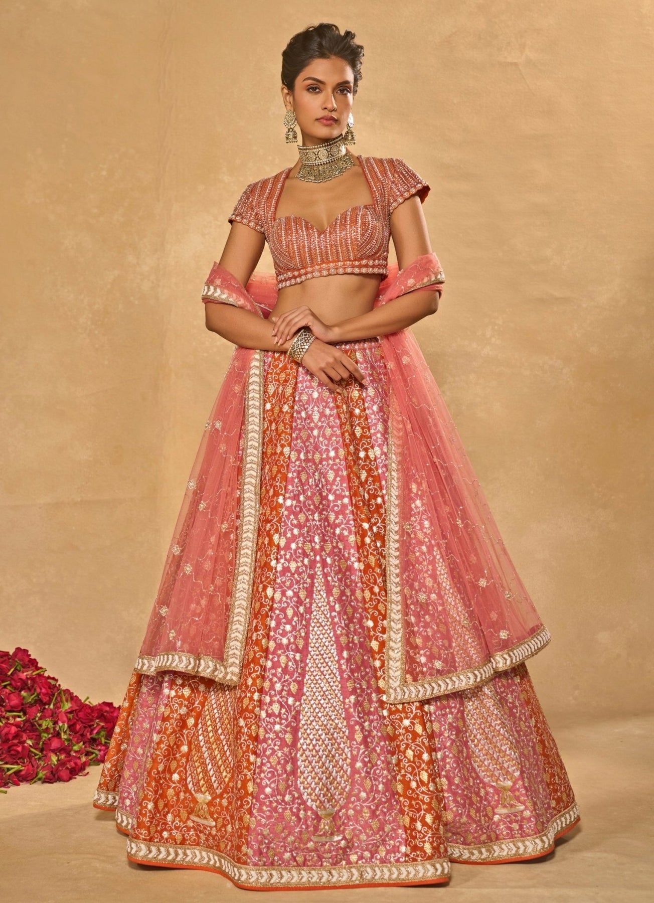 Celebrate each milestone moment in vibrant Lilac Pink and Orange Lehenga Set. The raw silk lehenga is intricately embroidered with pita, glass beads, stones, pearls, zardozi and zari for radiant texture. It is paired with a sweetheart-neck cap sleeve blouse delicately embellished to perfection, and completed with a heavily encrusted pink soft net dupatta.