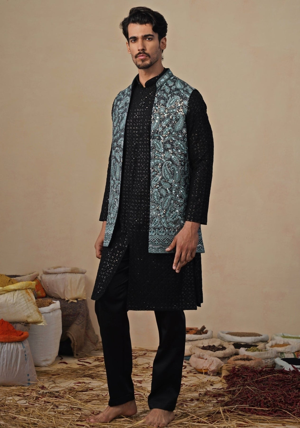 Defined elegance meets celebratory dressing in this Firozi Blue and Black Kurta Jacket Set, designed for elevated family occasions. The straight pants offer a crisp, tailored foundation that keeps the look sharp and balanced. The georgette kurta features subtle surface detailing that adds texture without excess, while the sleeveless jacket commands attention with intricate embroidery and mirror work that catches the light beautifully. Together, the elements create a polished statement ideal for evening festivities.