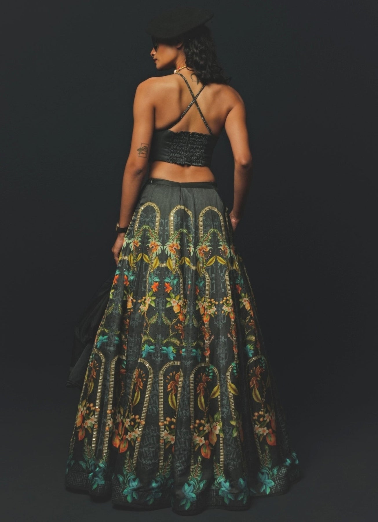 Charcoal Grey Linen Satin Lehenga With Corset Blouse Basil Leaf - Fabilicious Fashion