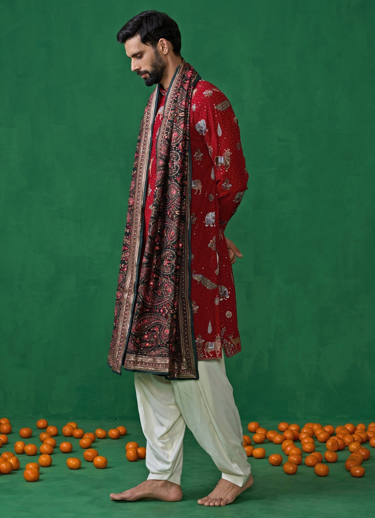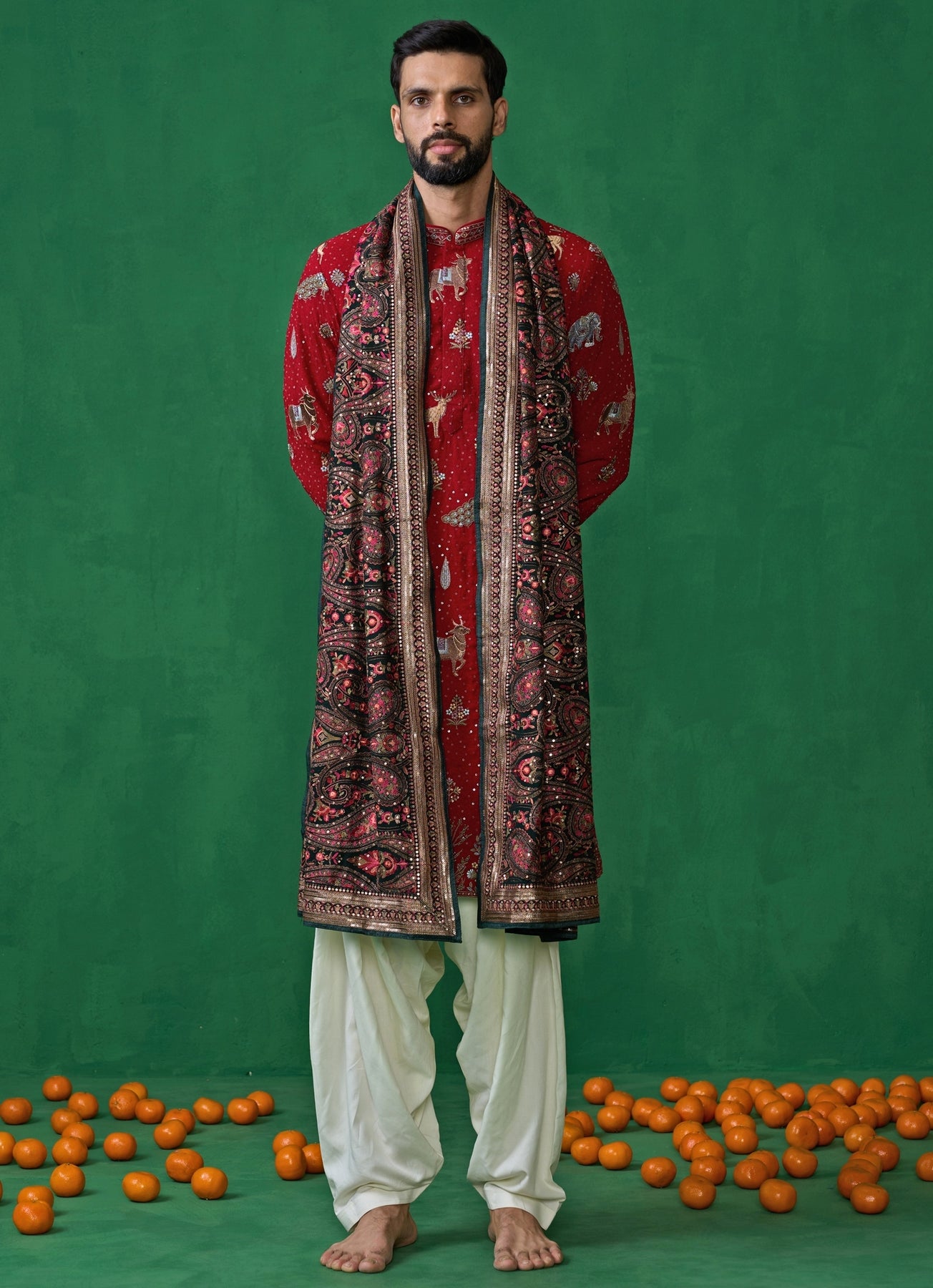 Make an impression in this red embroidered georgette dhoti kurta set, where cultural artistry meets contemporary elegance. The long georgette kurta is adorned with intricate Pichwai-inspired embroidery featuring elephants, deer, and traditional motifs that bring the fabric to life with rich storytelling. It is paired with softly draped Patiala-style bottoms and a contrasting stole with complementary embroidery.