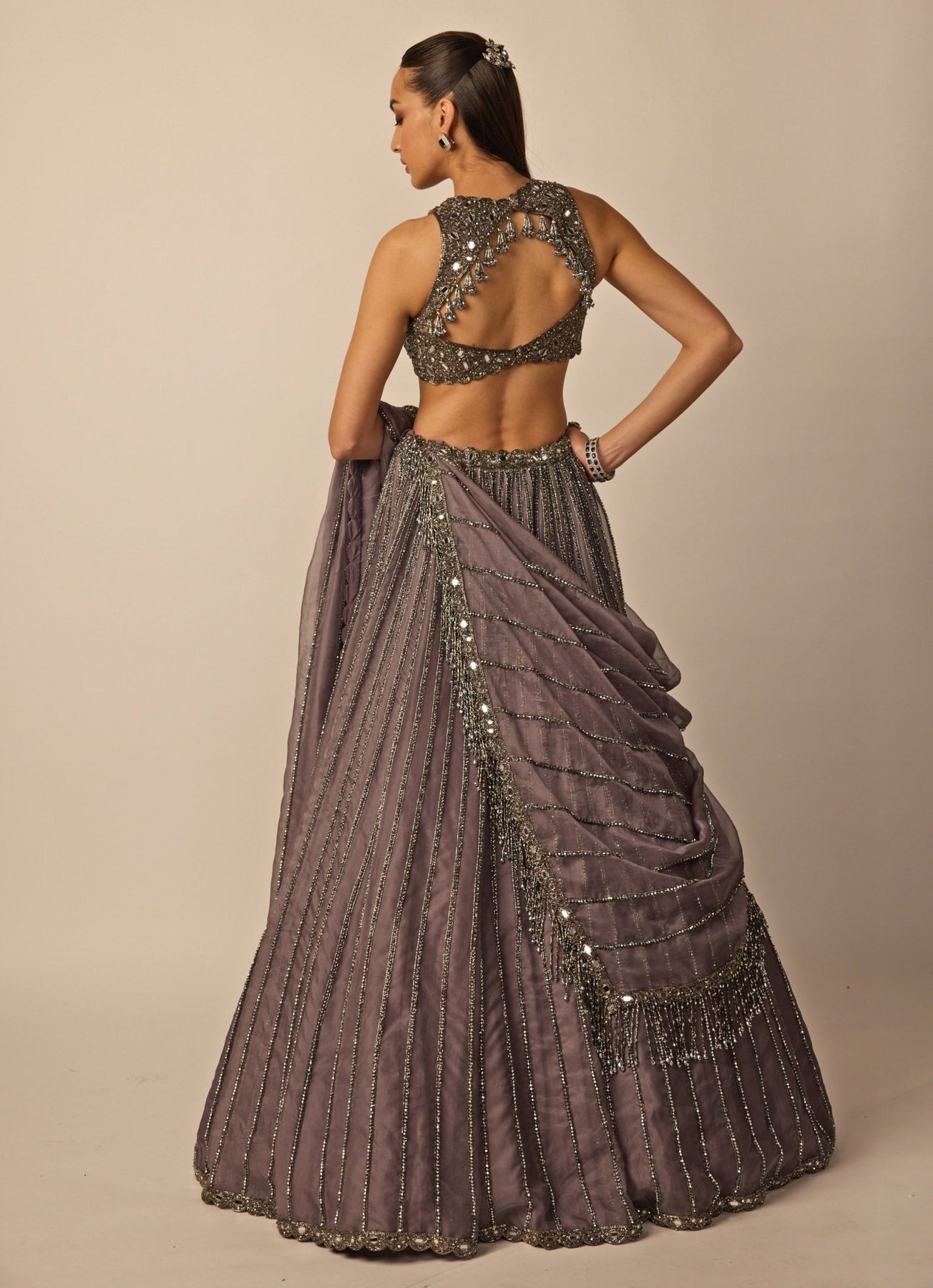 Step into your engagement with timeless elegance in the Metallic Grey Lehenga Set that feels modern and luminous. The organza lehenga and dupatta are intricately hand embroidered in linear patterns using cutdana and crystal details for refined sparkle. A high neck blouse balances the richness with clean structure, making this look both striking and effortlessly sophisticated.
