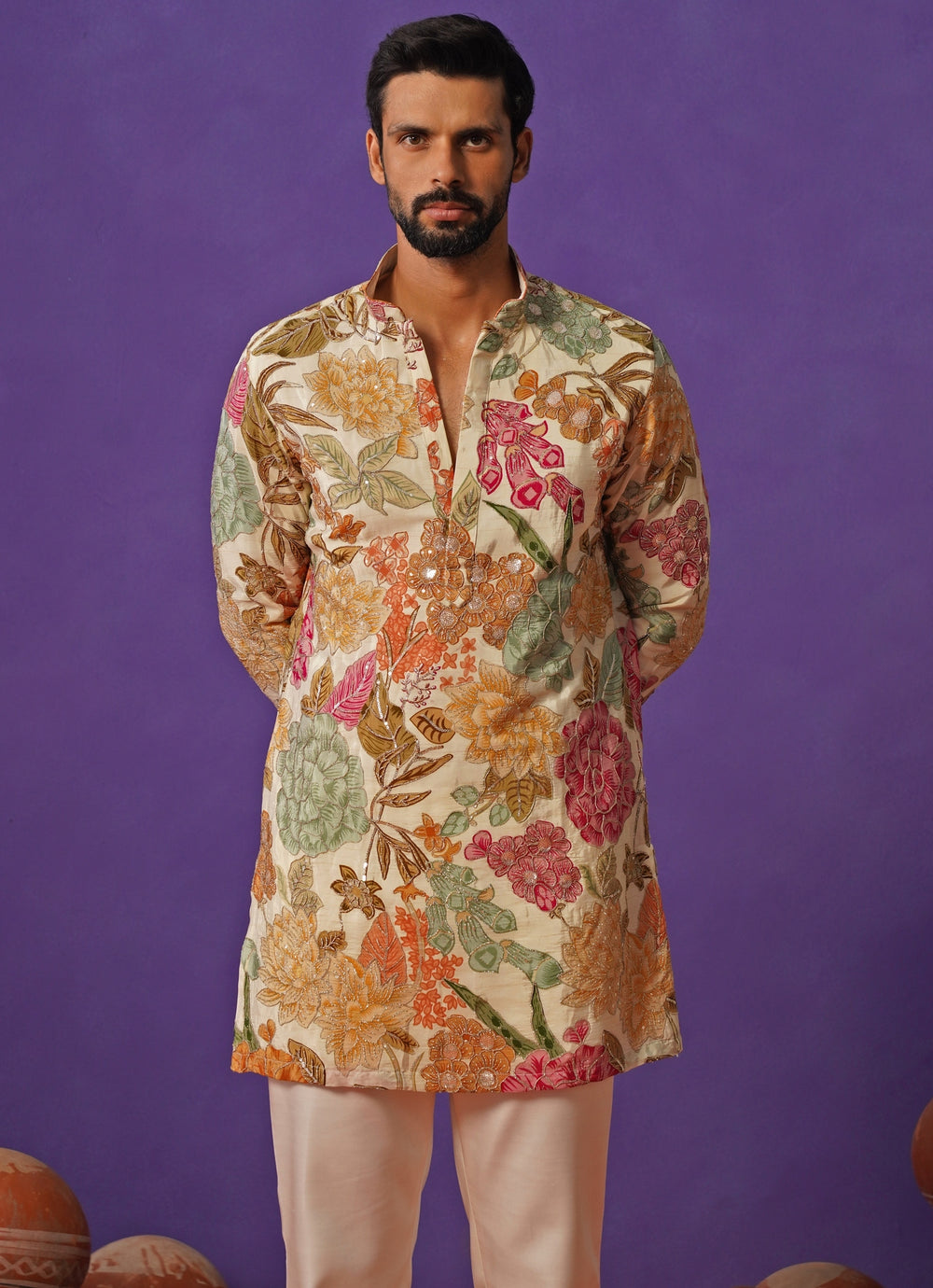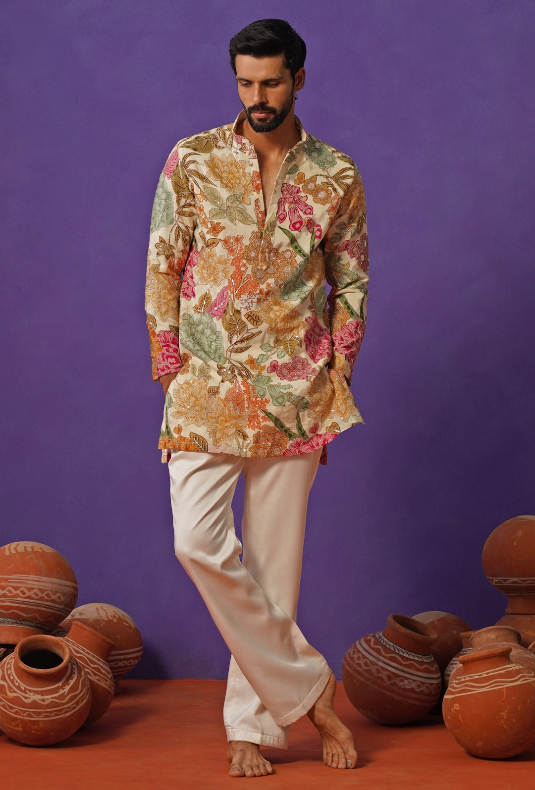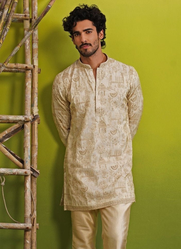 Ivory Floral Silk Short Kurta Set