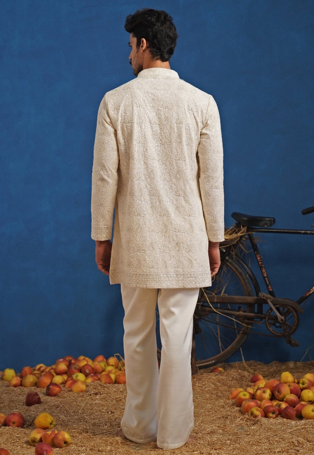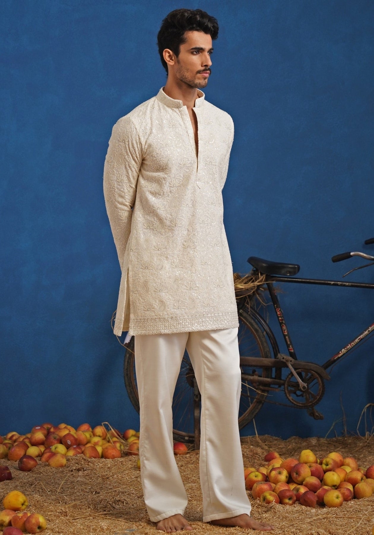 Lean into timeless occasion dressing with this Ivory Short Kurta Set that feels effortlessly elevated. Neat straight pants create a balanced finish, paired with a classic short kurta featuring a structured neckline and fine all-over surface detailing for subtle texture. The minimal, polished styling works beautifully for roka evenings and intimate celebrations, finished with classic mojris and a clean, modern watch.