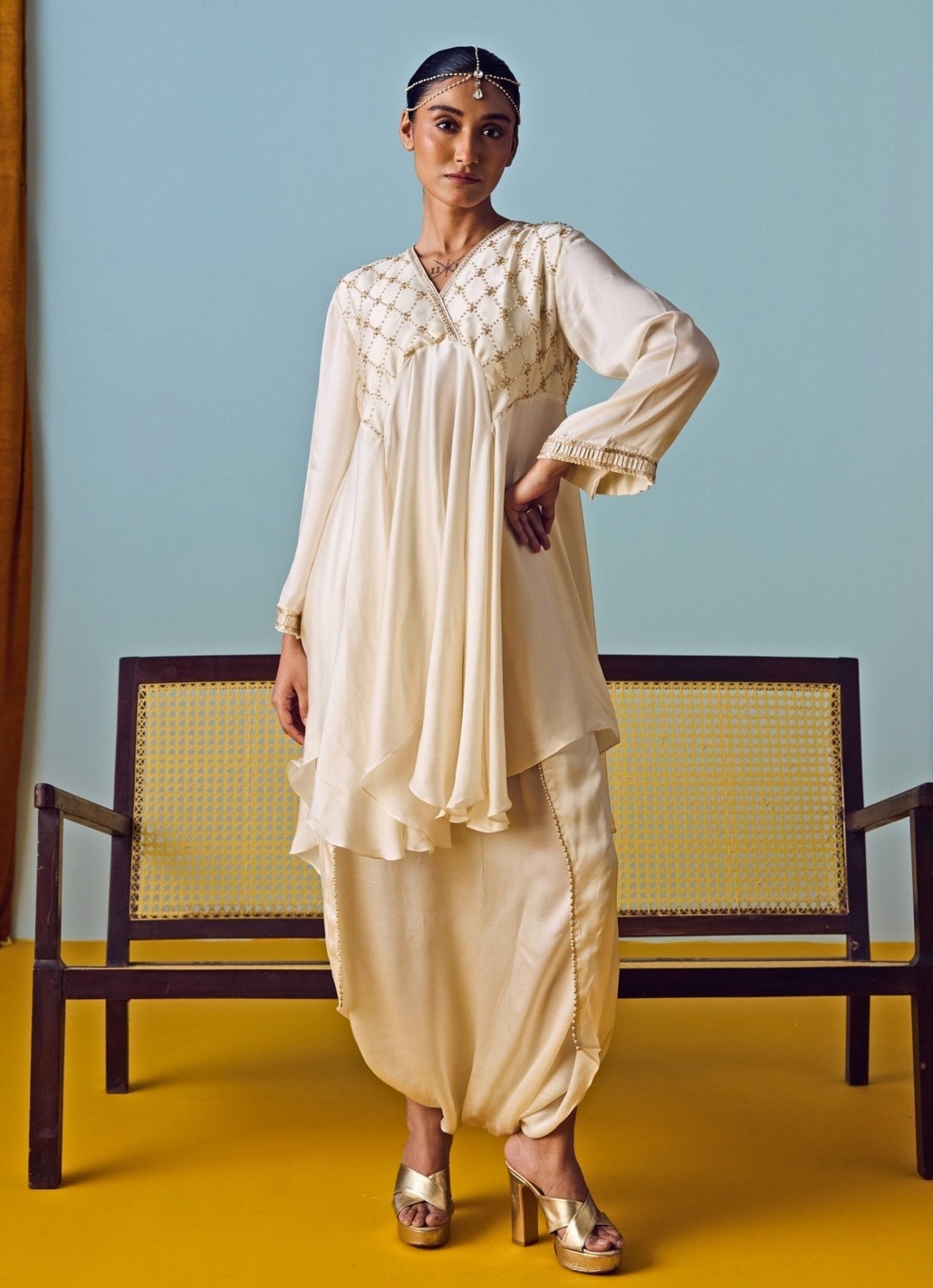 Radiate joy and sophistication at weddings in this Pearl White Kurta and Draped Skirt Set. The dhoti-style drape skirt introduces fluid movement and festive grace for celebratory evenings. The asymmetric flared kurta is fitted through the upper body and opens into a flowing form from the embroidered yoke, adorned with pearls, sequins, beads, and zari threads that add refined shimmer.