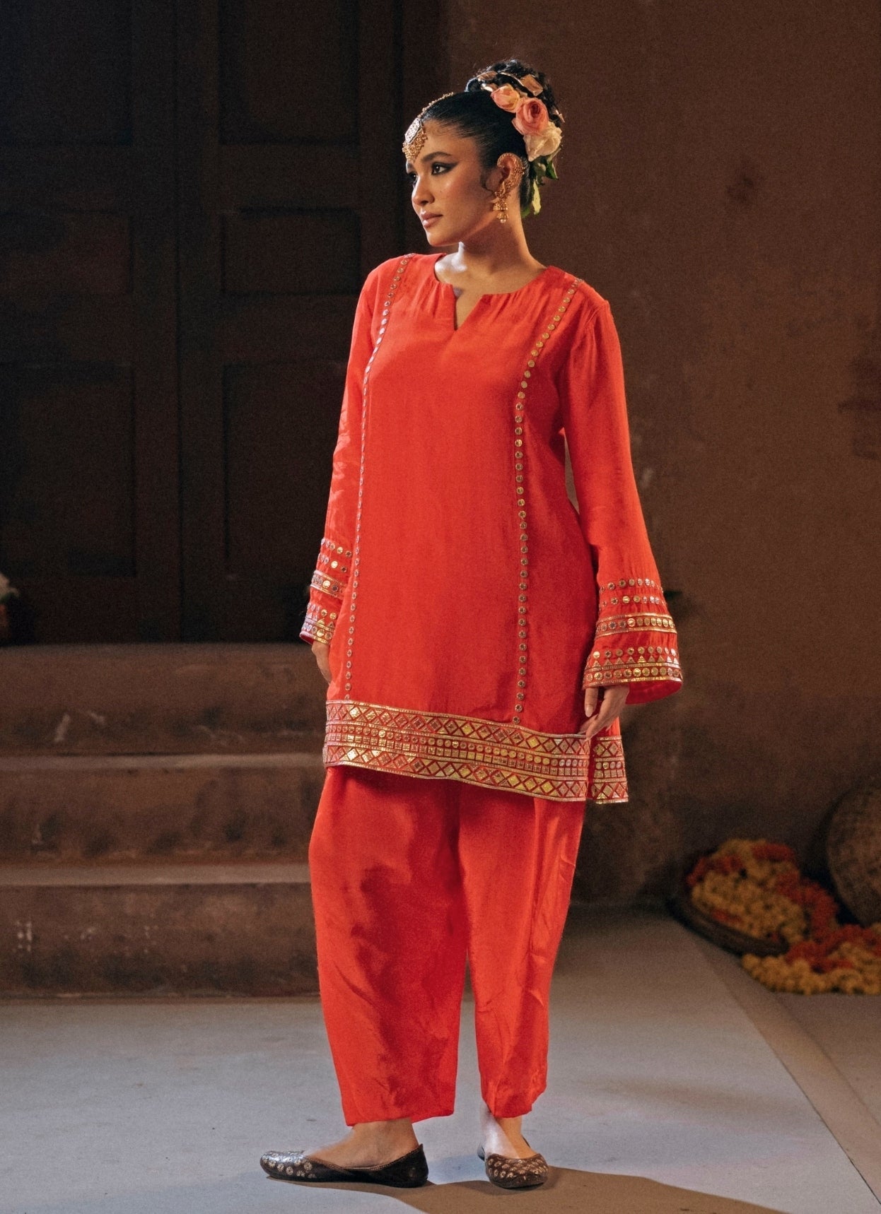 Reflect family pride and style wearing this timeless Red Kurta Salwar Set. The coordinating salwar offers ease and refined structure for celebratory evenings. The relaxed-fit kurta in crepe silk blend features light gold vegan leather appliqué inspired by traditional gota work, lending understated shimmer to wedding festivities.