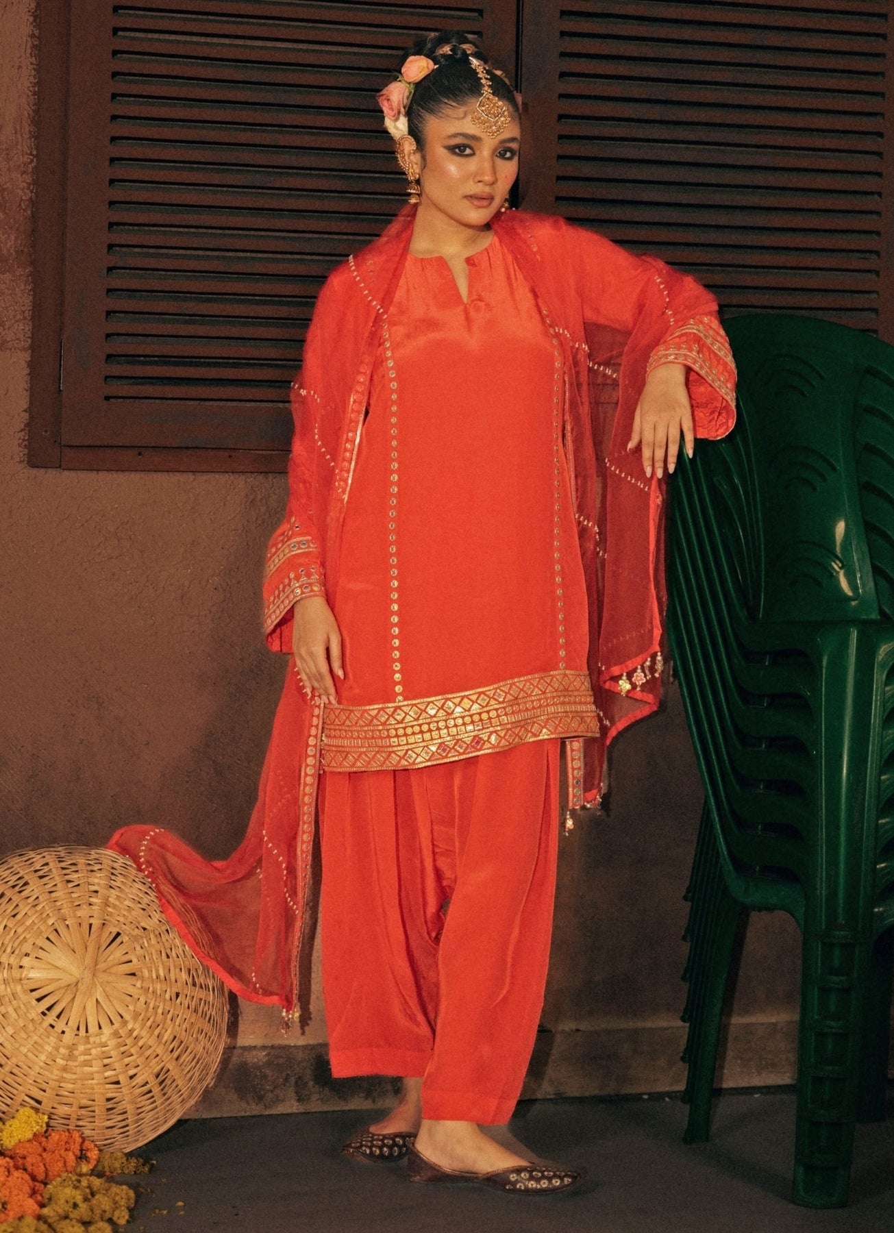 Elevate family festivities with this rich Red Kurta Salwar Set with Dupatta designed for pre-wedding celebrations. The coordinating salwar ensures comfort and graceful flow. The relaxed kurta is detailed with light gold vegan leather appliqué in a gota-inspired pattern, finished with an organza silk dupatta that adds delicate refinement.