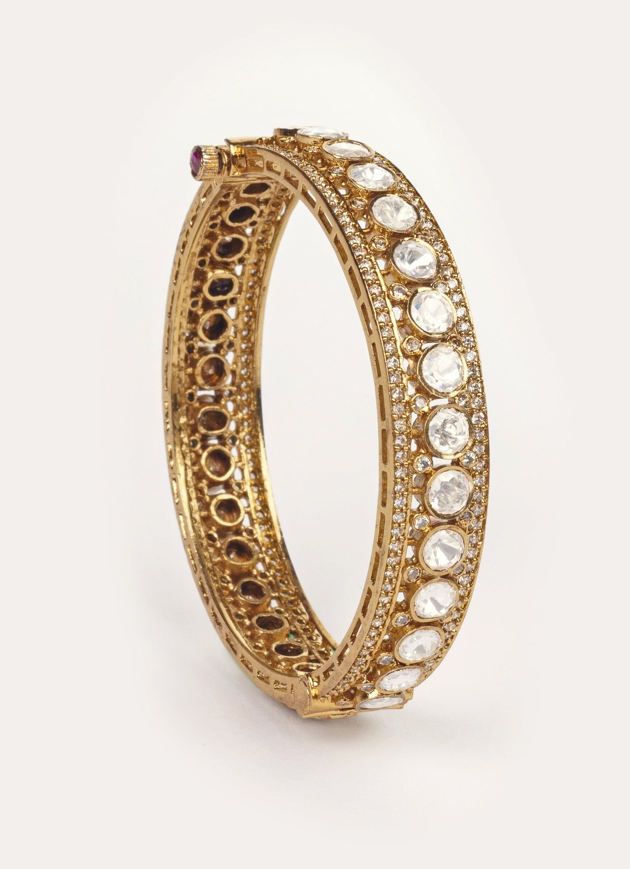 A pair of elegant bangles finished in antique two-tone gold and adorned with polki. Intricate detailing gives them a festive, luxurious appeal that flatters every movement — a classic complement for a saree.