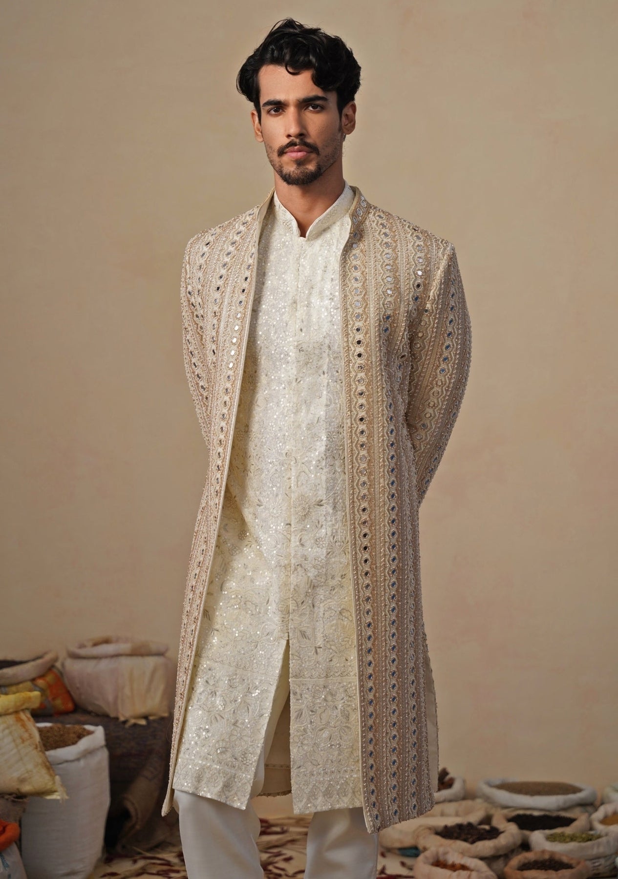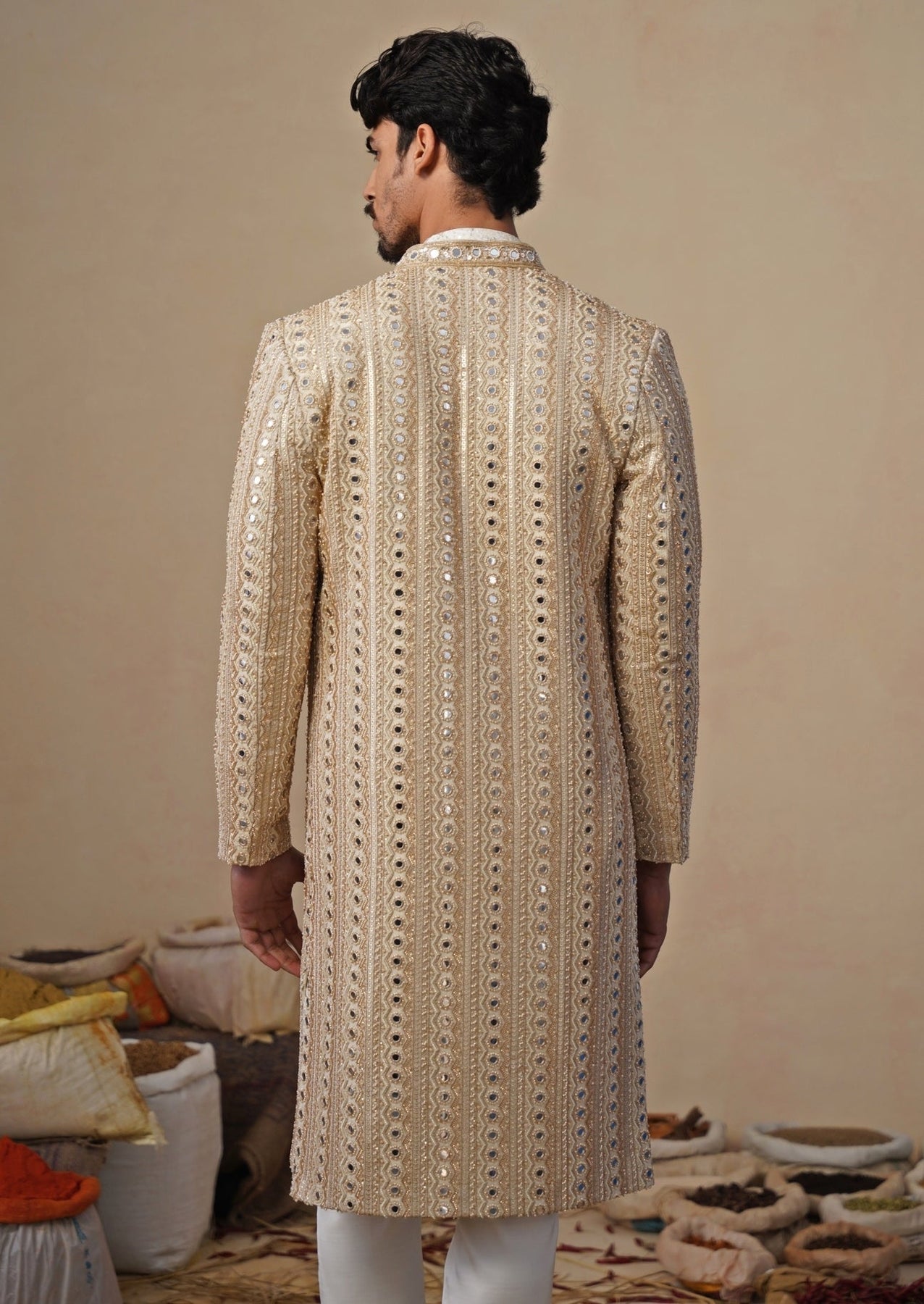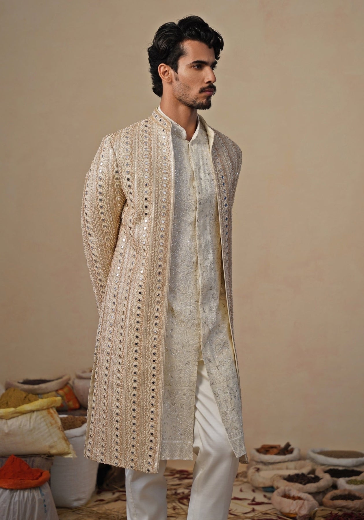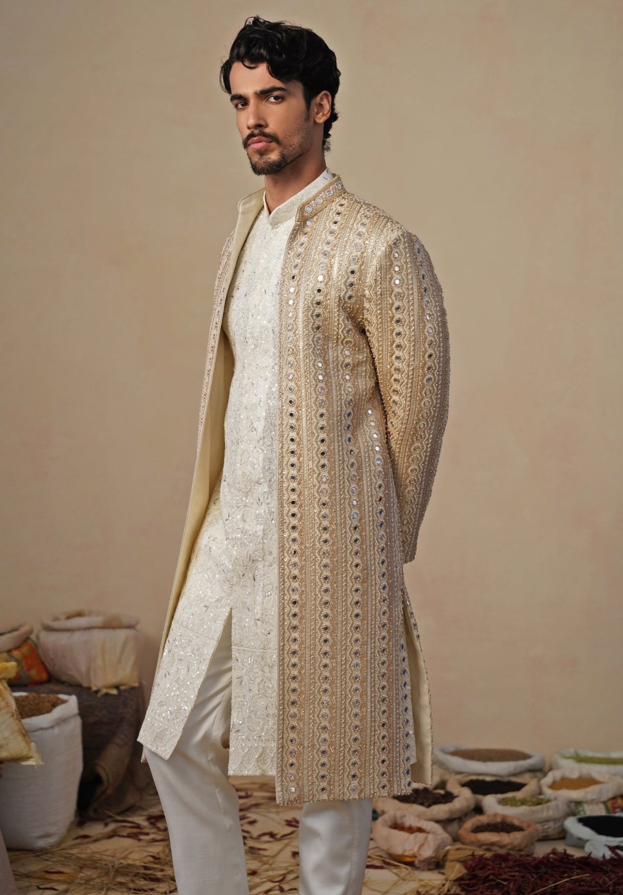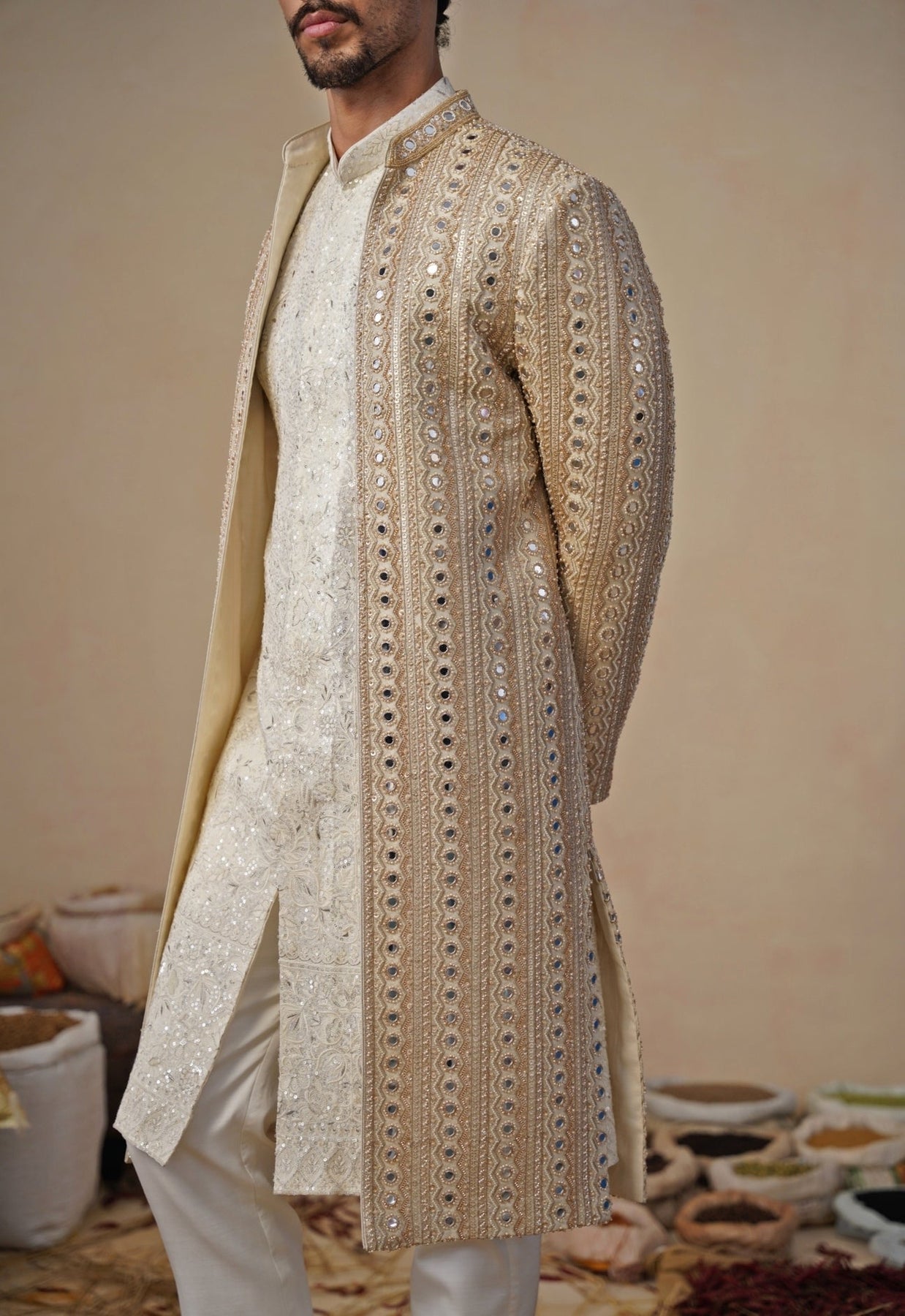 Gold and Ivory Georgette Sherwani Set