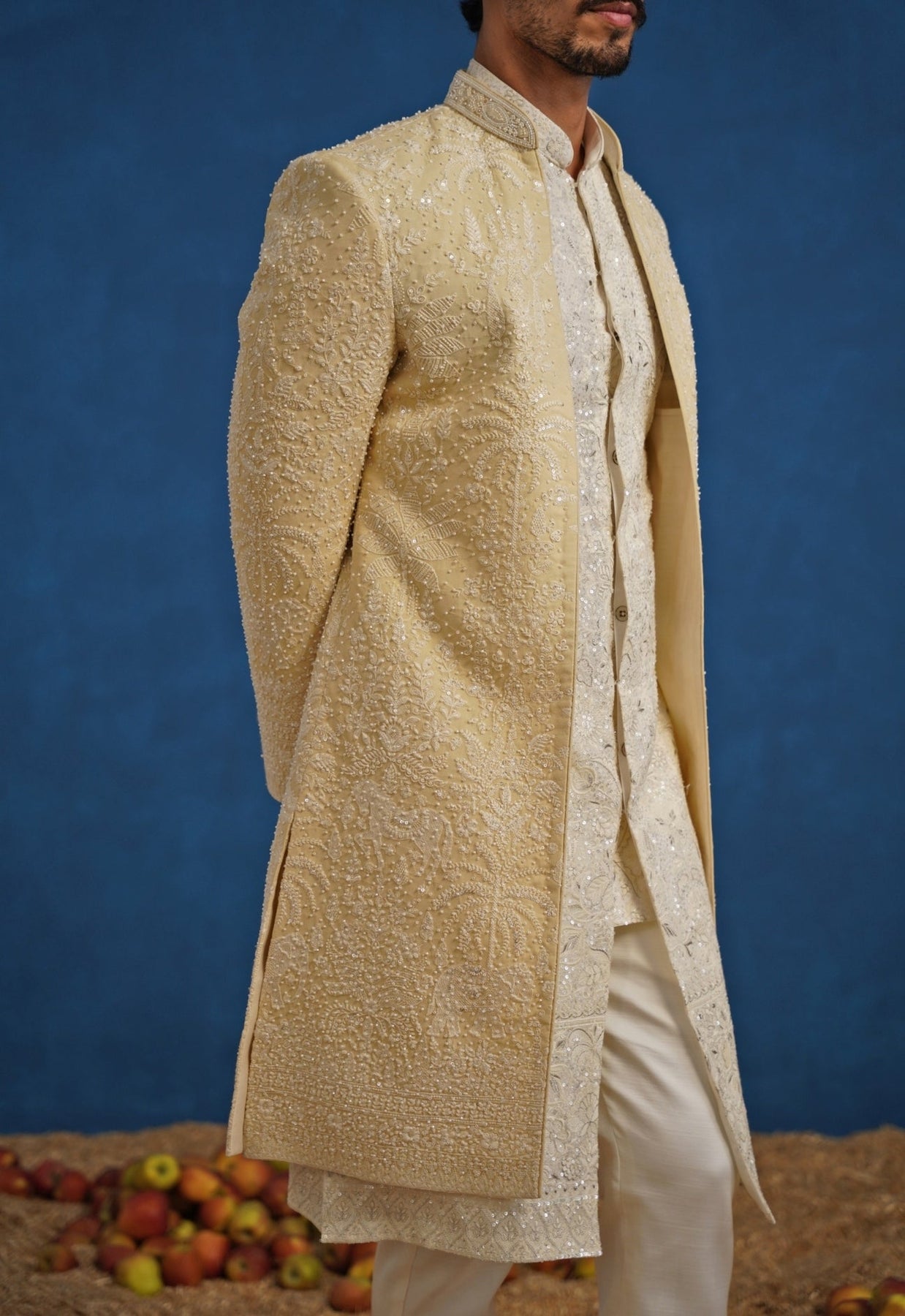 Step into celebration-ready grandeur with the Gold Sherwani Set. Crisp straight pants keep the finish tailored, while the inner kurta stays refined with understated detailing. The sherwani is richly worked with cutdana embroidery in floral and ornamental patterns, creating a luminous texture that glints under evening lights, balanced by a clean neckline and long, structured lines.
