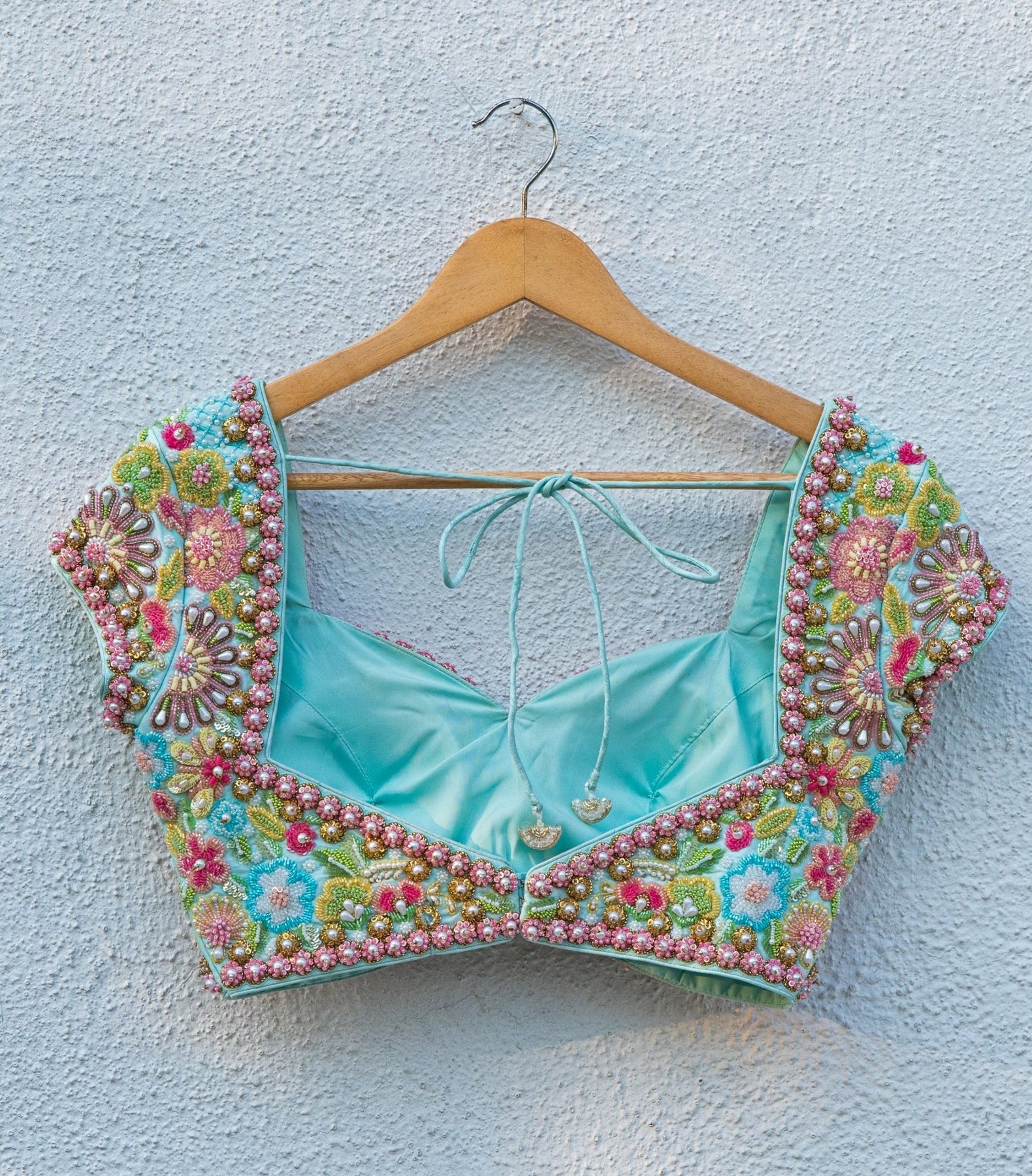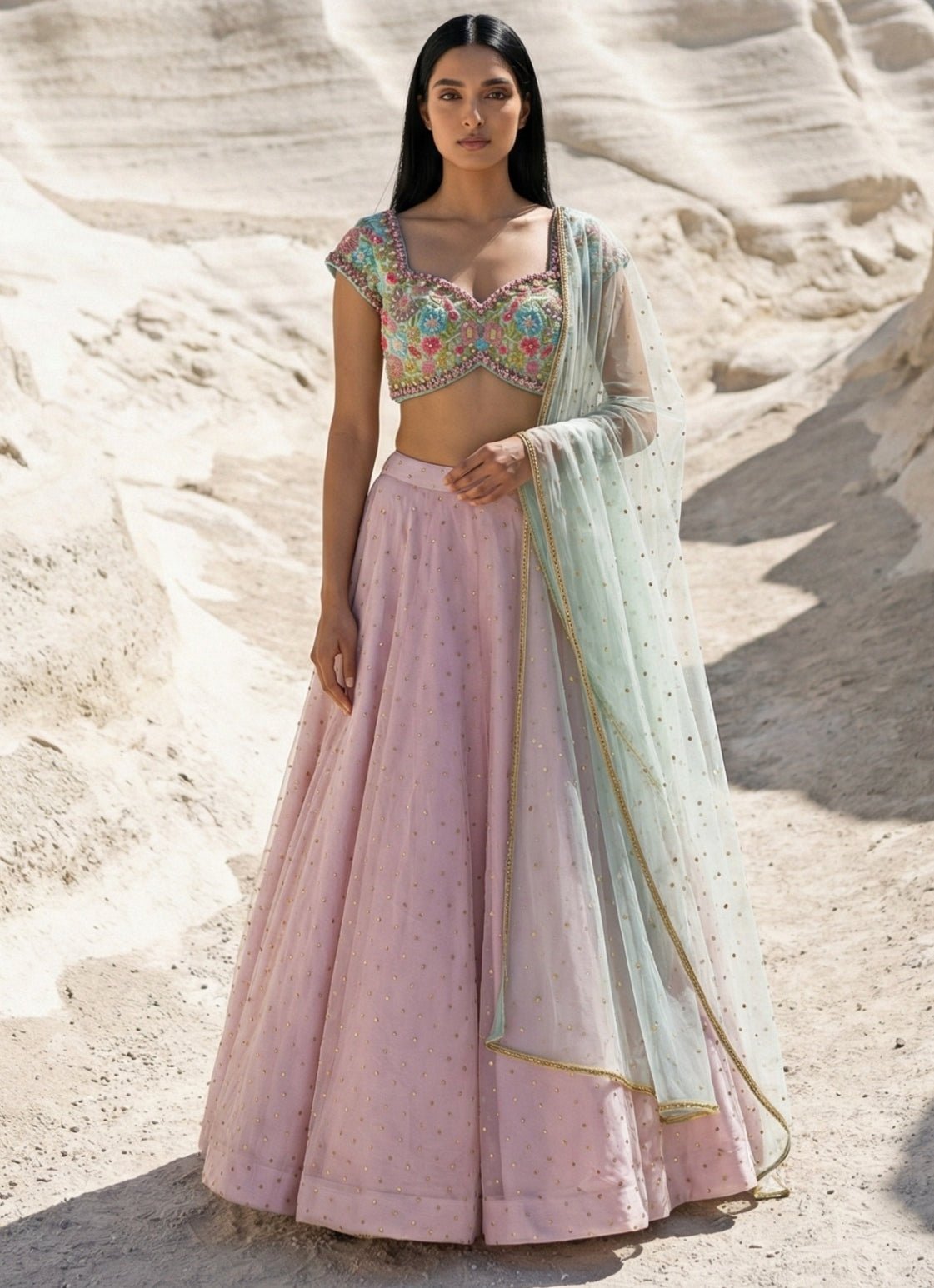 Bring family-focused glamour to each occasion in this Pastel Pink Lehenga Set with Blue Blouse that blends soft colour with statement contrast. The lehenga is finished with stonework and subtle shine, while the blue raw silk blouse features cutdana, beadwork, gold work, sequins, and intricate embroidery for a rich, festive highlight. Completed with a blue soft net dupatta.