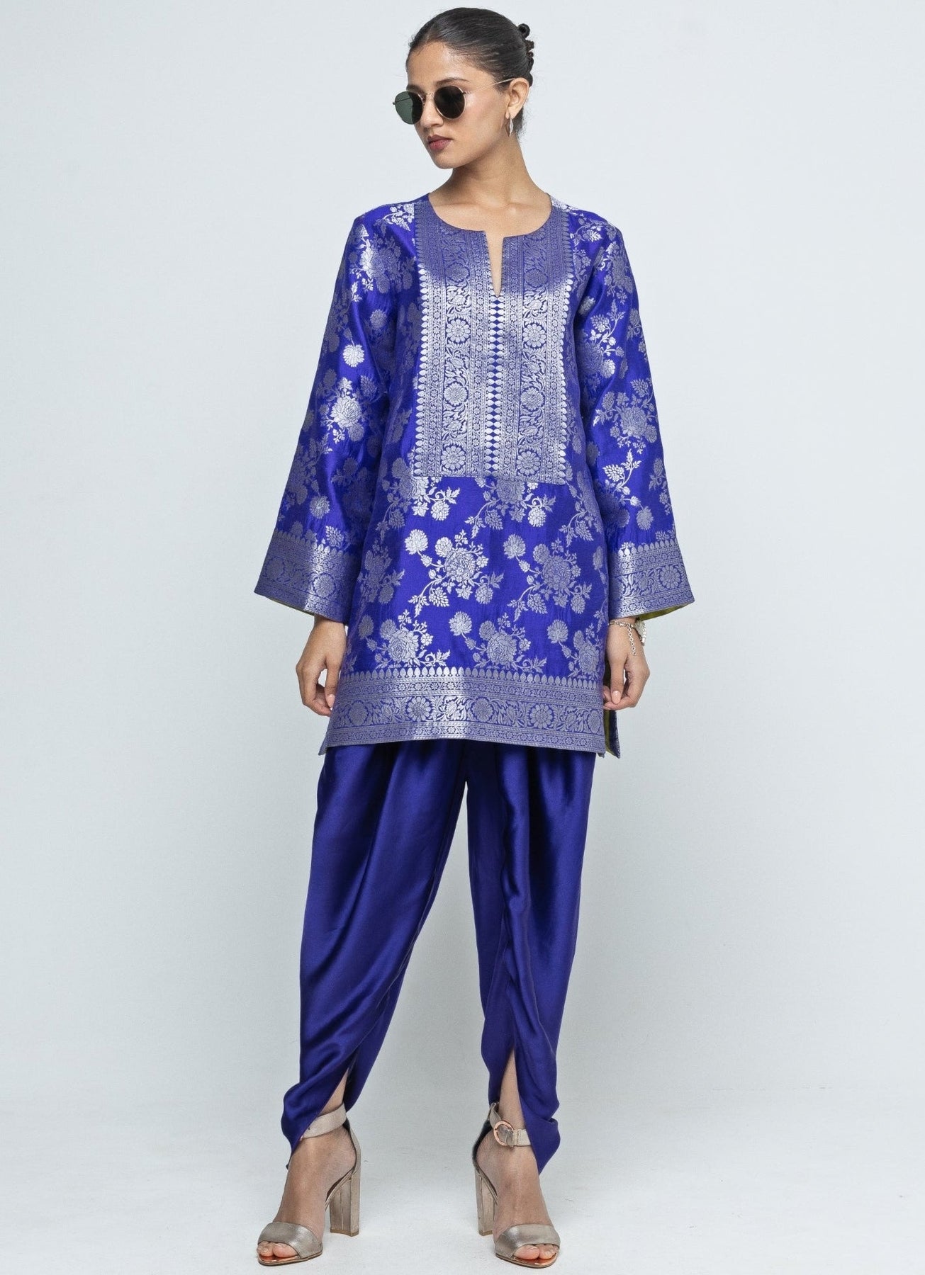 Reflect family pride and style wearing this Blue Kurta Dhoti Set. The kurta features intricate Banarasi-inspired weaving with floral jaal artistry that exudes regal craftsmanship. Paired with a matching dhoti showcasing complementary brocade detailing, the look blends tradition with polished sophistication. Ideal for intimate ceremonies and milestone moments, it brings understated luxury to every family celebration.