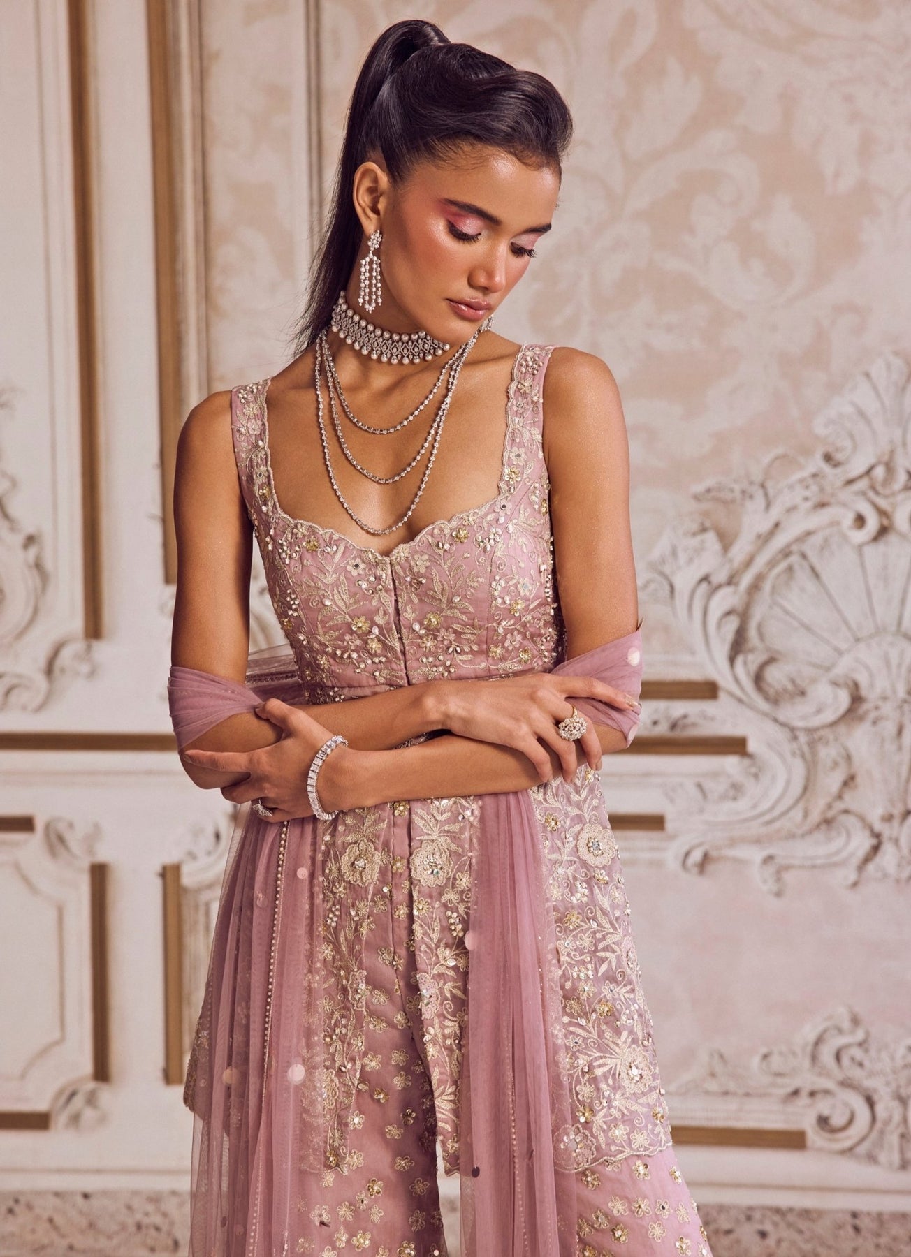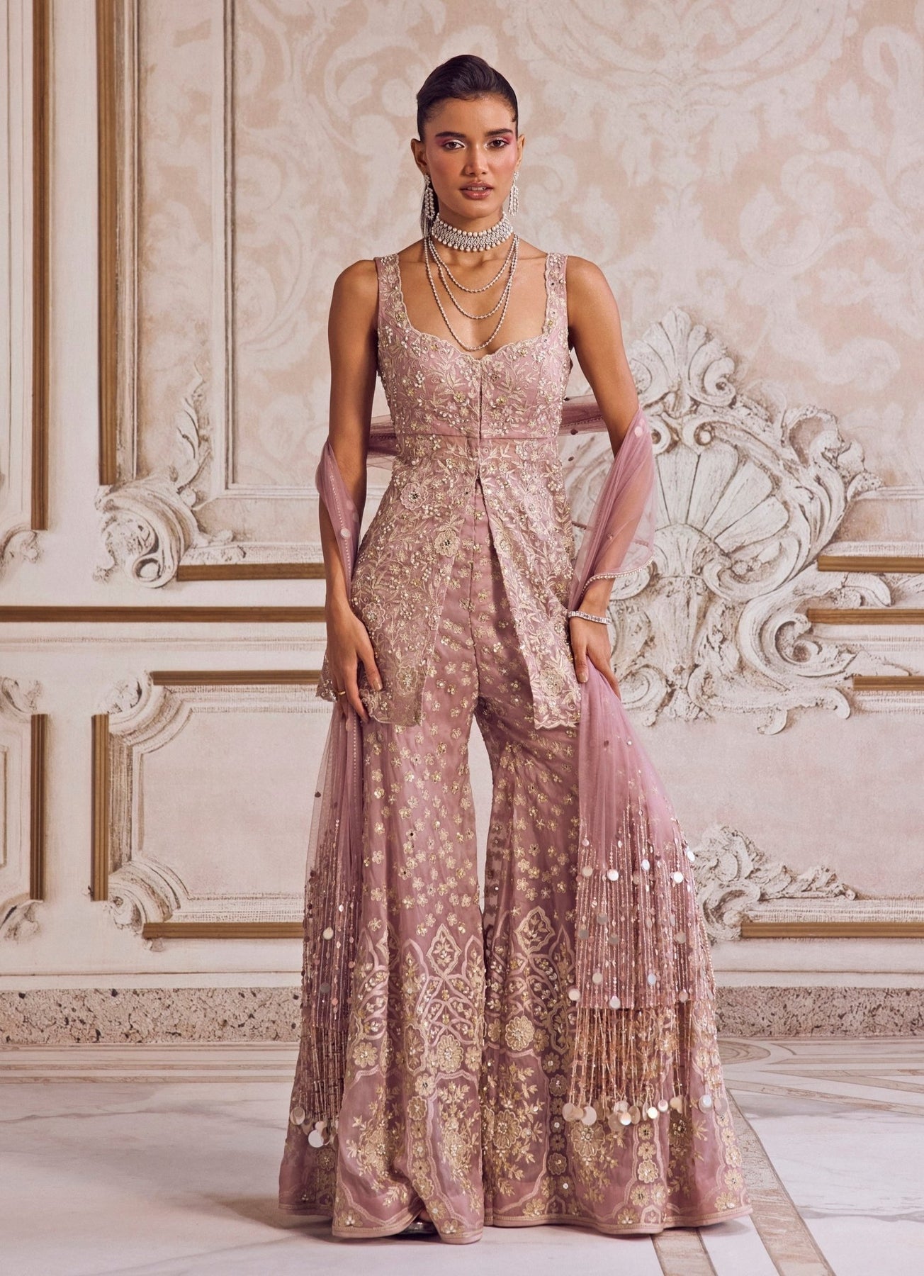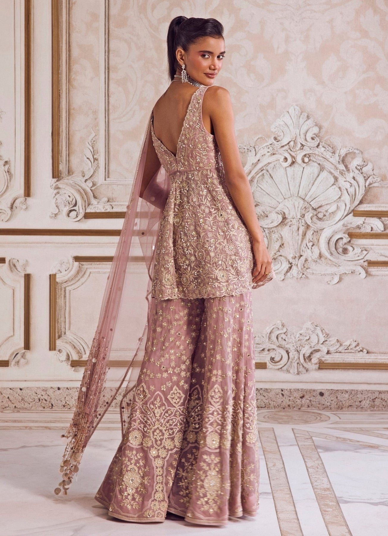 Elevate your bridal journey with the Champagne Lilac Peplum Kurta Pants Set. The peplum kurta glows in soft champagne hues, adorned with floral zari embroidery highlighted by pearls, sequins, and tiny mirrors. Cutwork detailing graces the neckline and hem, while the pants feature ornate motifs and subtle cheeta embroidery at the base. A dreamy net dupatta with statement tassels completes this celebration-ready creation.