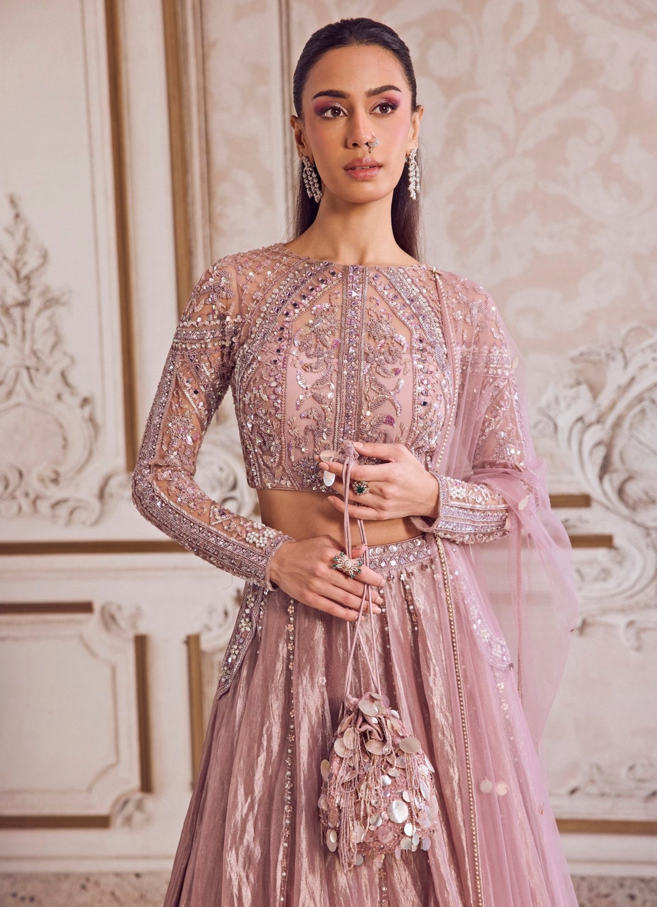 Celebrate your special day in the Champagne Lilac Lehenga Set. The pure silk tissue lehenga glimmers with refined artistry, featuring a scalloped border embroidered with floral and geometric patterns in cutdana, sequins, beads, and mirrors. Its full-sleeved blouse blends traditional craftsmanship with contemporary charm through exquisite hand embroidery, while subtle pockets add a touch of practicality. A sheer net dupatta with statement tassels completes this radiant look.
