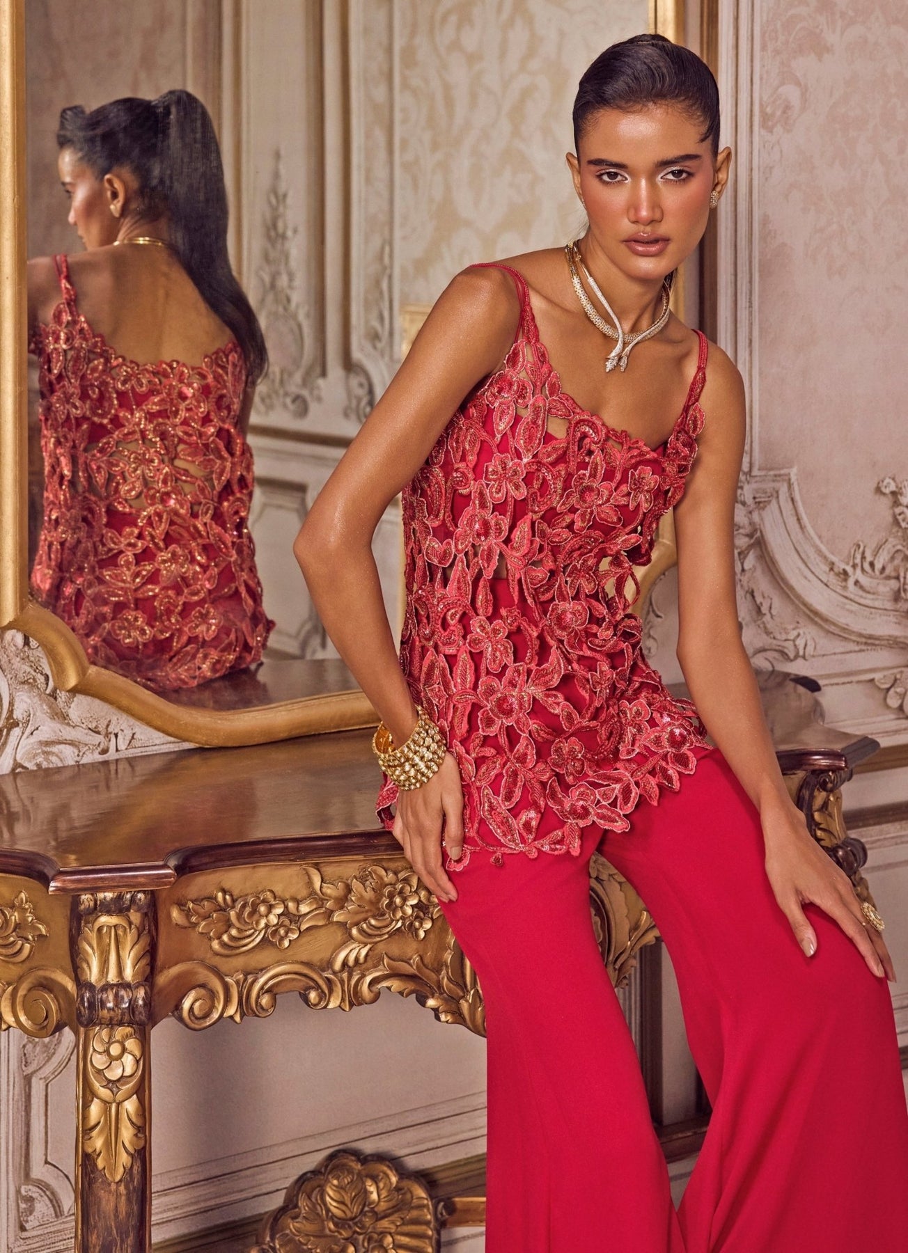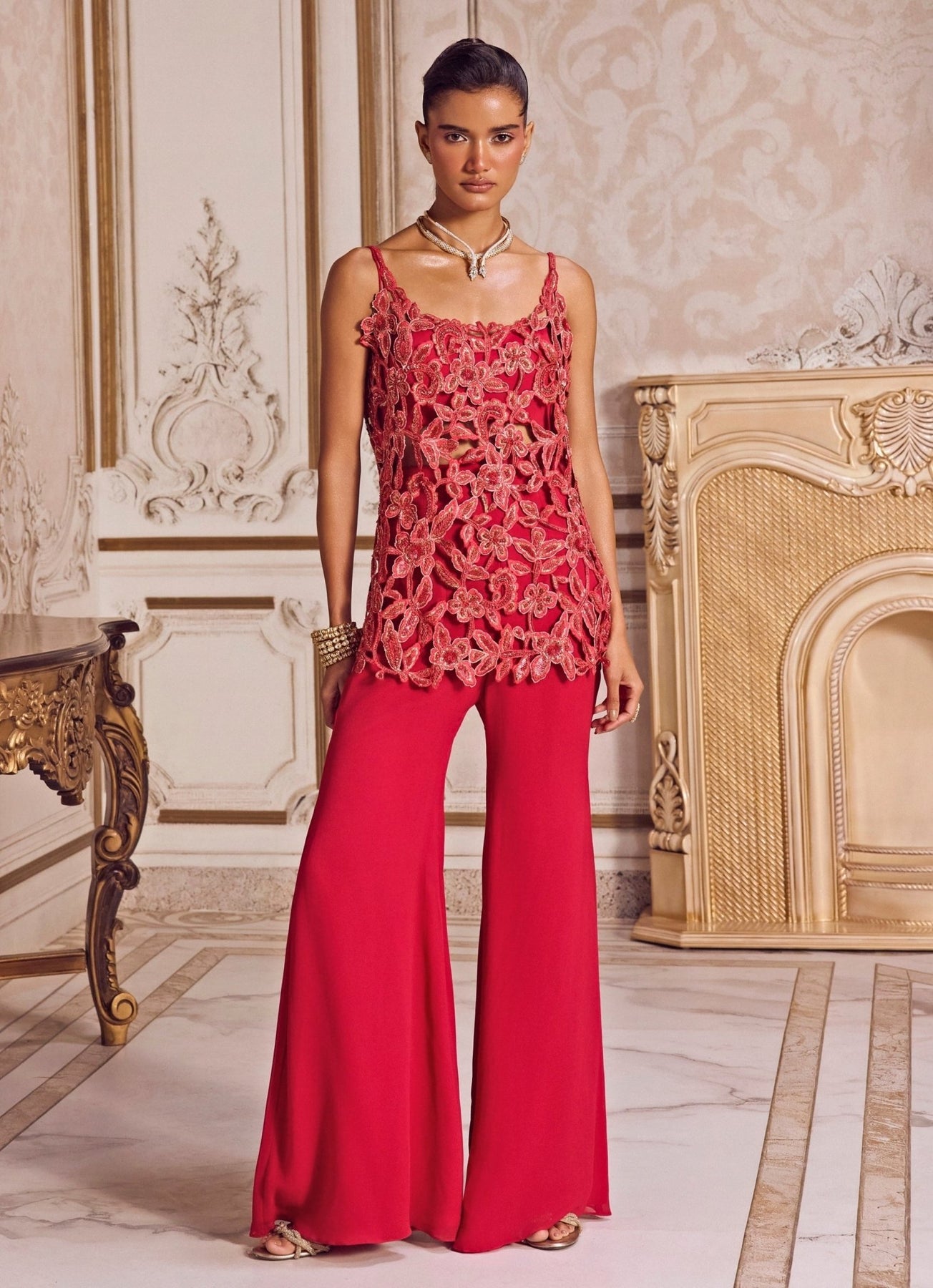 Capture effortless chic for every occasion in the Hot Pink Kurta Pants Set. The sheer floral cutwork kurta makes a statement with its exquisite embroidery, highlighted with zari, dori, cutdana, and sequins that shimmer softly with every move. Styled over a sleek bustier and paired with flowing kalidar pants in georgette, this look blends modern artistry with timeless grace—ideal for elegant celebrations.