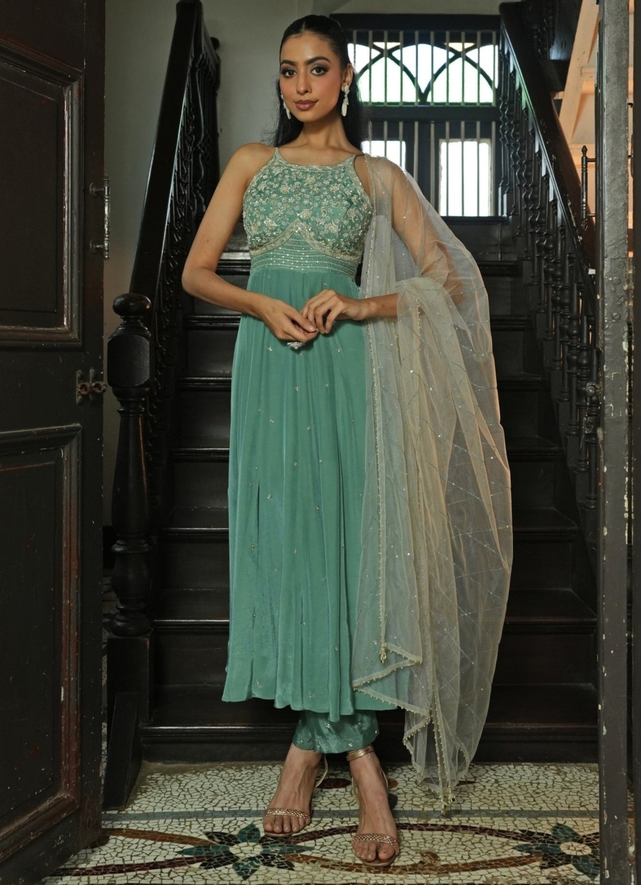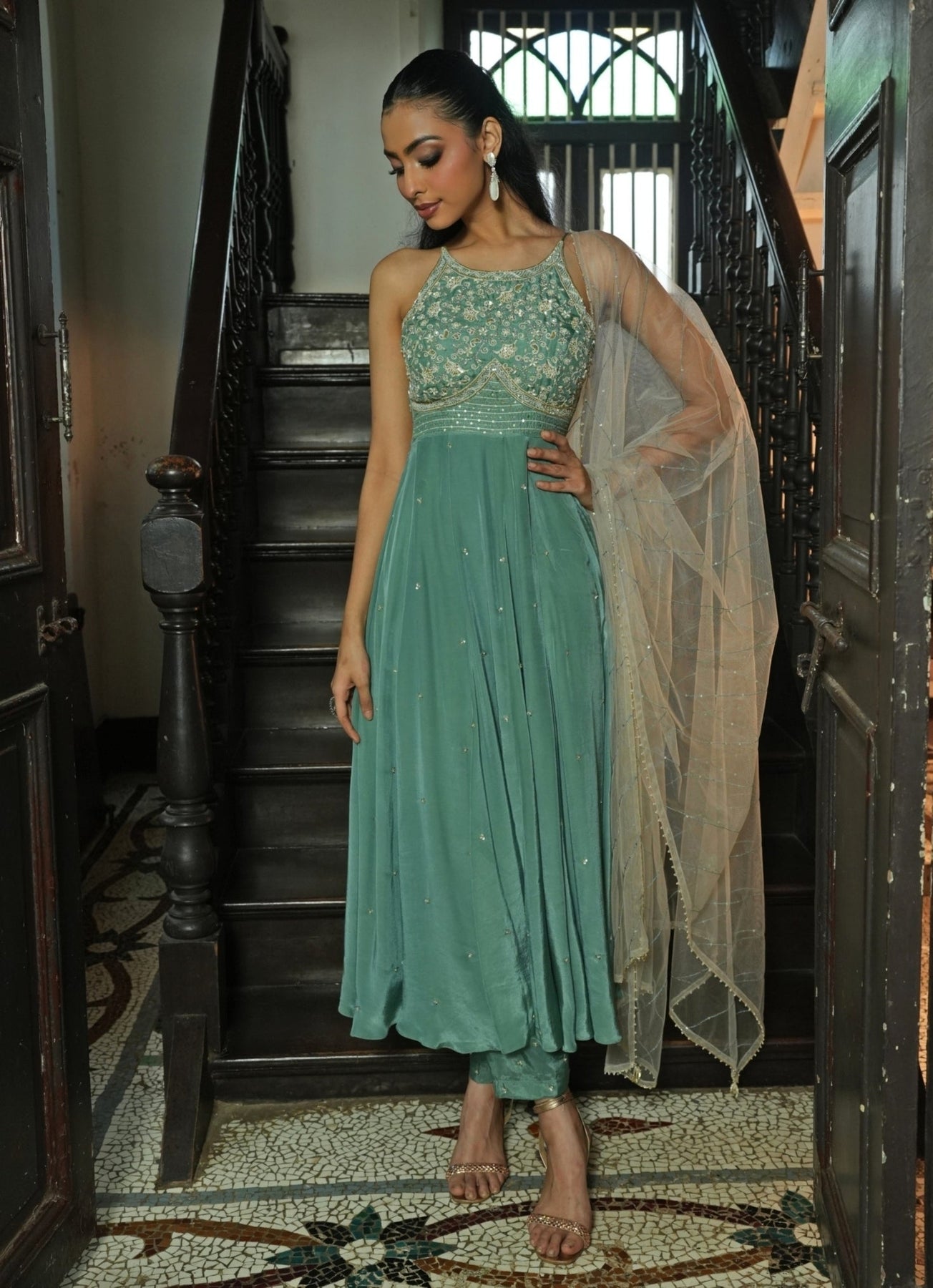 Step into festive glamour with this Sage Green Anarkali Set that feels fresh and elegant. The strap incut anarkali is detailed with resham, cutdana, sequins and pearl embroidery, offering refined sparkle. Embroidered pants provide balance, while the ivory dupatta adds contrast and softness to the overall look.