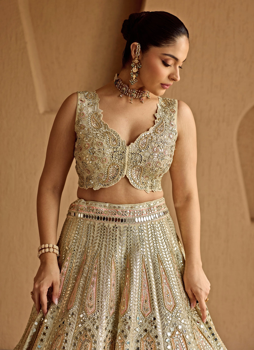 Ivory and Peach Mirror Embroidered Tissue Lehenga