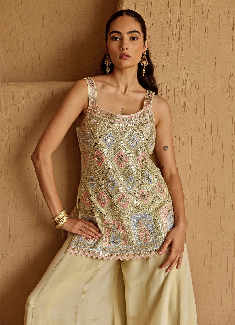 Ivory and Pink Mirror Embroidered Tissue Kurta Sharara Set