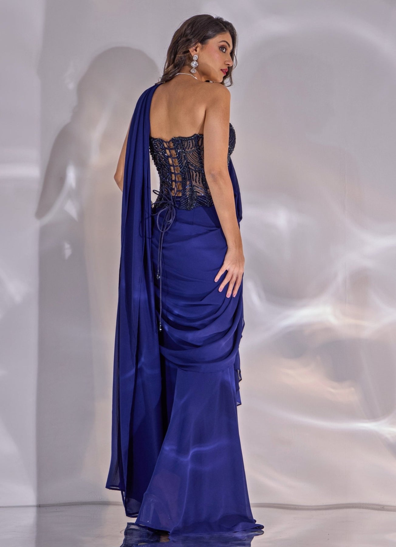 Midnight Blue Georgette Pre-Draped Saree With Corset Blouse